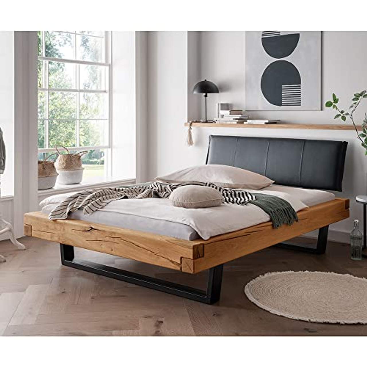 Lomadox Doppelbett Ehebett Bett Echtholz MassivholzMassivholz Doppelbett, 200cm, Eiche massiv, mit Echtleder-Kopfteil, UPPSALA-137 Ruhe und Natürlichkeit bringen die Schlafzimmermöbel der Serie UPPSALA-137 in dein Schlafzimmer. Echtholzbetten aus Fichte oder Eiche in Kombination mit verschiedenen Fußgestellen aus Metall oder Echtholz lassen sich mit ebenfalls aus Echtholz gefertigten Nachttischen und Unterbett-Schubladen kombinieren.Die gewollten Wuchsrisse im Holz machen dein Schlafzimmer einzigartig. Verfügbar in 4 verschiedenen Breiten - 140, 160, 180 und 200cm - ist für jede Raumgröße etwas dabei! Materialdaten | Oberflächen: Bettrahmen: Massivholz, Wildeiche Natur Füße: Metallkufen, schwarz Kopfteil: Echtleder Beschläge: Metall Lieferumfang | Produktinformation | Maßangaben: 1x Bett mit Echtleder-Kopfteil (Halterung ca. 4x9cm) Liegefläche (BxL) ca. 200x200cm Mittelbalken Abstand der Kufen ca. 141cm Einlegetiefe Lattenrost ca. 12cm Höhe Oberkante Bettseite ca. 42cm Bodenfreiheit ca. 26cm Stärke Bettrahmen ca. 9cm Belastbarkeit
