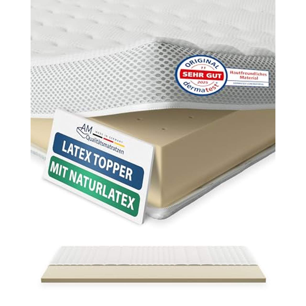 Premium Latex-Topper 90x200 cmDer hochwertige, hochelastische Latex-Topper (ca. 5,5 cm Höhe, RG 65) von AM Qualitätsmatratzen passt sich dank der guten Rückstellkraft und gleichzeitiger Anpassungsfähigkeit optimal jeder Körperkontur an und sorgt damit für eine ideale Druckentlastung der Wirbelsäule: Beste Voraussetzungen für erholsame Nächte und einen tiefen Schlaf.Der hochwertige Lyocell-Bezug mit versteppter Klimafaser (400 g/m²) und eingearbeitetem Klimaband (500 g/m²) unterstützt den Latex-Kern bestmöglich in seinen feuchtigkeits- und temperaturregulierenden Eigenschaften. Die von Experten entwickelte „Antirutsch-Unterseite“ des Latex-Toppers verhindert das Verrutschen auf der Matratze oder einem Boxspringbett. Das Raumgewicht von 65 kg/m³ dieser Matratzenauflage gewährleistet eine außerordentliche Langlebigkeit. Unsere Topper werden komplett in Deutschland gefertigt. Alle verarbeiteten Materialien sind auf Schadstoffe geprüft und für Allergiker geeignet (19.0.86717 Hohenstein HTTI). Dank des 4-seitigen