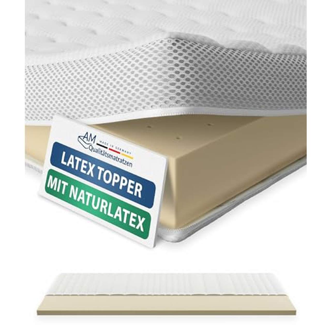 Premium Latex-Topper 90x200 cmDer hochwertige, hochelastische Latex-Topper (ca. 5,5 cm Höhe, RG 65) von AM Qualitätsmatratzen passt sich dank der guten Rückstellkraft und gleichzeitiger Anpassungsfähigkeit optimal jeder Körperkontur an und sorgt damit für eine ideale Druckentlastung der Wirbelsäule: Beste Voraussetzungen für erholsame Nächte und einen tiefen Schlaf.Der hochwertige Lyocell-Bezug mit versteppter Klimafaser (400 g/m²) und eingearbeitetem Klimaband (500 g/m²) unterstützt den Latex-Kern bestmöglich in seinen feuchtigkeits- und temperaturregulierenden Eigenschaften. Die von Experten entwickelte „Antirutsch-Unterseite“ des Latex-Toppers verhindert das Verrutschen auf der Matratze oder einem Boxspringbett. Das Raumgewicht von 65 kg/m³ dieser Matratzenauflage gewährleistet eine außerordentliche Langlebigkeit. Unsere Topper werden komplett in Deutschland gefertigt. Alle verarbeiteten Materialien sind auf Schadstoffe geprüft und für Allergiker geeignet (19.0.86717 Hohenstein HTTI). Dank des 4-seitigen