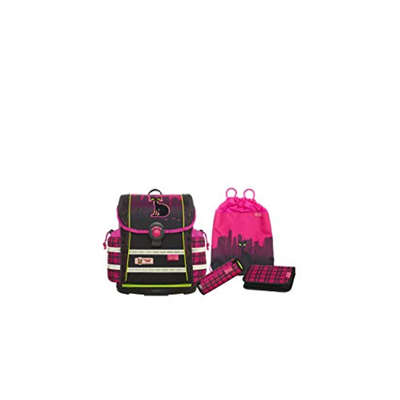 Dieses McNeill 4-TLG Schulranzen-Set ist perfekt für zierliche Kinder. Es hat stark gepolsterte und optimal geformte Schultergurte mit Schnellverschluss und einen verstellbaren, abnehmbaren Brustgurt. Sein großer Innenraum ist für eine ausgewogene Gewichtsverteilung gut unterteilt. Die Tasche hat einen Druckknopfverschluss, der sich magnetisch schließen lässt, Seitentaschen mit Ruck-Zuck-Verschluss, eine schmale ergonomische Rückenpolsterung und retroreflektierende Streifen. Das Set besteht aus Schulranzen, Sportschuh-/Gymnastikbeutel, Etui gefüllt mit 23 tlg. und Federtasche als Rolle.