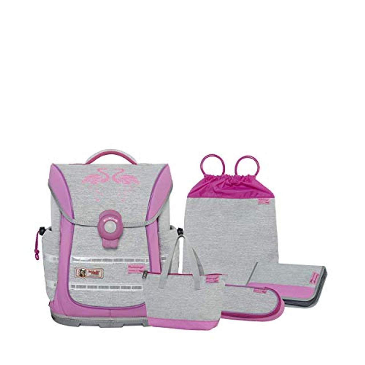 Der McNeill Mc Neill TIE Ergo Light Pure 5TLG Flamingo Limited Schulranzen wird in Deutschland aus strapazierfähigem Polyestermaterial hergestellt und verfügt über eine schicke Fashion-Bag XS, die zum Schulranzen-Design passt. Er hat ein ergonomisch geformtes, anschmiegsames Rückenpolster mit rückenentlastender Polsterung im Lendenwirbelbereich, stark gepolsterte und optimal geformte Schultergurte mit Schnellverschluss, einen flexibel verstellbaren Brustgurt, einen großen Innenraum mit rückennahem Bücherfach, ein großes Vorderfach, zwei Seitentaschen mit Kordelzug, Magnetverschluss, einen praktischen Tragegriff oben und einen Stundenplan in der Klappe. Außerdem verfügt er über ein stabiles Bodenfach, einen reflektierenden Doppelstreifen für mehr Sicherheit und hat die Maße 30x40x22 cm bei einem Volumen von 20 l und einem Gewicht von 1,15 kg mit 4 Jahren Garantie.