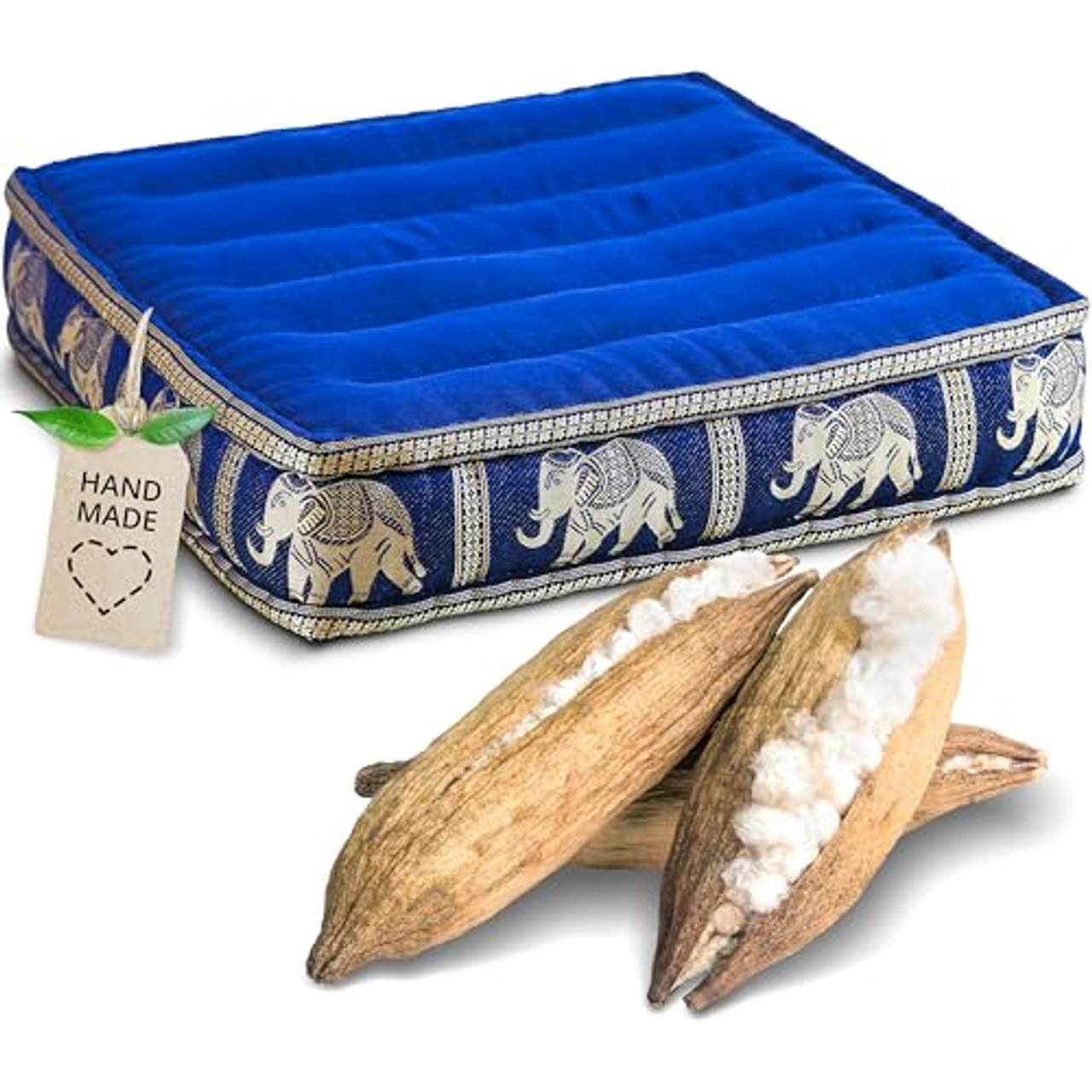 Das livasia Kapok Bodensitzkissen Sitzkissen ist ein Meditationskissen. Es verfügt über eine wachsbeschichtete Kapok-Füllung und ist somit sowohl für den Innen- als auch für den Außenbereich geeignet. Außerdem ist der Baumwollbezug mit einer Seidenstickerei mit Elefantenmotiv versehen. Die Maße sind 50 cm x 50 cm x 10 cm und das Gewicht beträgt 1,6 kg. Dieses Kissen wird von kleinen Familienbetrieben in Asien handgefertigt und ohne Zwischenhändler direkt zum Kunden importiert.