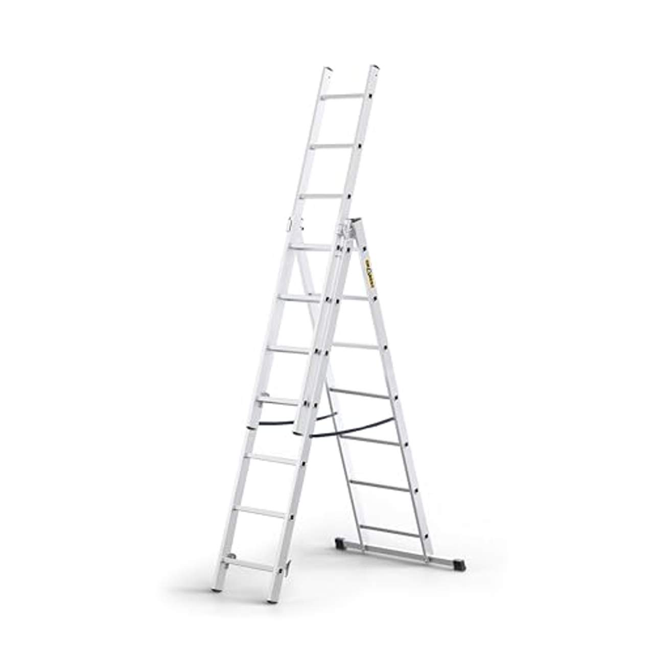 DRABEST Home Aluminium-Leiter 3x7 SprossenDie DRABEST Vielzweckleiter ist eine sichere und vielseitige Lösung für Arbeiten, die hoch hinausgehen. Die Leiter aus robustem Aluminium mit 3 x 7 Sprossen ist dein idealer Partner für Projekte im Haushalt, bei Renovierungen oder auf dem Bau. Sicherheit und Stabilität bei jeder Nutzung Mit einer maximalen Belastung von 150 kg bietet die Leiter dir die nötige Stabilität für verschiedenste Aufgaben.Die hochwertigen Leitersprossen haben ein Profil von 25 mm x 25 mm und sind mit rutschhemmenden Rillen ausgestattet, die dir bei jedem Schritt sicheren Halt garantieren. Für zusätzliche Stabilität sorgt ein 40 mm x 20 mm breiter und 675 mm langer Stabilisator, der die Auflagefläche der Leiter auf dem Boden deutlich vergrößert. Die rutschfesten, aufsteckbaren Stabilisatorfüße werden mit stabilen Klammern montiert, sodass du dich jederzeit sicher fühlen kannst. Die Vielzweckleiter entspricht der Europäischen Norm EN 131 und bietet dir somit höchste Sicherheit.Maximale Flexibilität im Einsatz Diese Leiter ist nicht nur robust, sondern auch äußerst praktisch. Sie ist klappbar und lässt sich so auf kompakte Transportmaße von 1,9 m x 0,46 m x 0,13 m reduzieren, was die Lagerung und den Transport zum Kinderspiel macht. Wenn alle drei Teile in einer aufrechten Position ausgeklappt sind, erreicht die Leiter eine beeindruckende Länge von 3,25 m, sodass du auch höhere Stellen mühelos erreichst. Gurte aus strapazierfähigem, wasserfestem Kunststoff schützen zuverlässig vor Überdehnung der Leiter. Die verzinkten Stahlverbindungselemente ermöglichen das sichere Aufklappen der Leiter in aufrechter Position und mit ausgefahrenem dritten Element, wobei die Sperre automatisch in der gewählten Position arretiert.