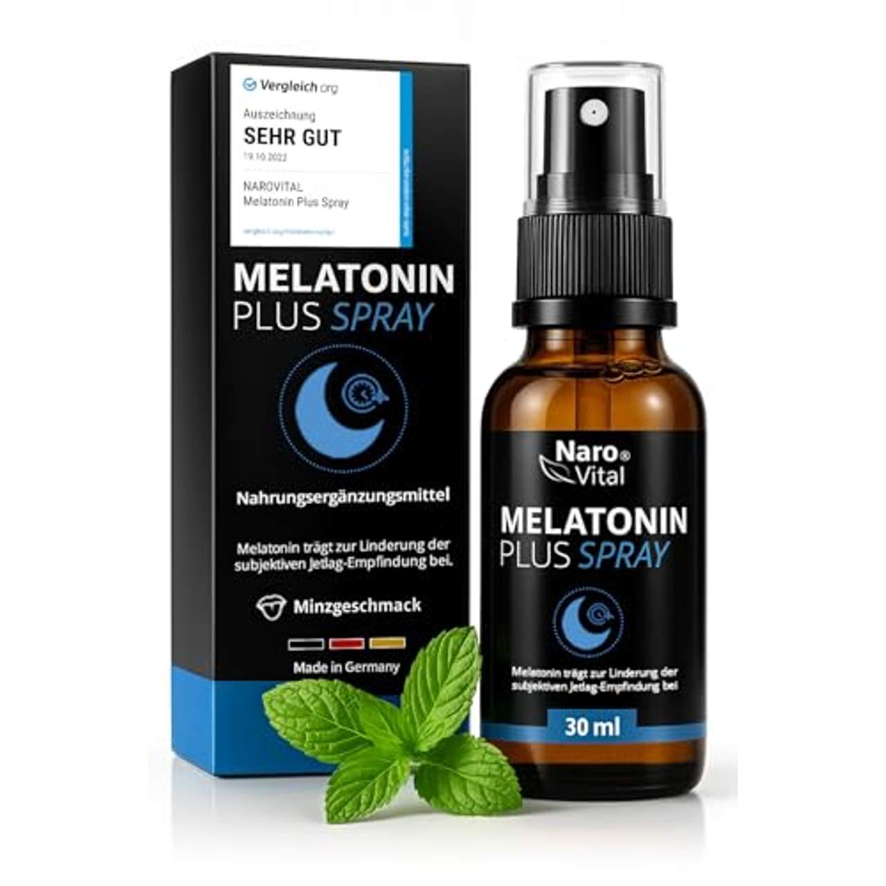 NaroVital Melatonin EinschlafsprayMit hochdosiertem Melatonin Der moderne Lebenswandel kann dazu führen, dass der Körper weniger Melatonin produziert, ein Hormon, das wichtig für den Schlaf-Wach-Rhythmus ist. Faktoren wie Stress, Handy- und TV-Nutzung am Abend können die Ausschüttung von Melatonin hemmen.Mit dem Melatonin Spray steht dir ein einzigartiges Pre-Night-Supplement zur Verfügung, das speziell für die Einnahme vor dem Schlafengehen konzipiert wurde. Abgerundet wird die potente Schlafhormon-Formula des Melatonin Sprays durch wertvolle Pflanzenextrakte aus Melisse, Baldrian, Passionsblume, Ashwagandha und Lavendel.All diese Pflanzen haben gemein: Sie zählen zu den bekanntesten Substanzen in Pre-Night-Supplements. Deine Hilfe bei lästigen Jetlags Welch großen Einfluss Melatonin auf deinen Körper nimmt, wird klar, wenn du nach einer interkontinentalen Reise an Jetlag leidest!Da die neue Zeitzone nicht zu deiner inneren Uhr passt, sind Schlaflosigkeit in der Nacht und Müdigkeit am Tag die unangenehme Konsequenz! Aber keine Sorge, denn mit dem Melatonin Spray Plus von NaroVital naht Hilfe: Schließlich gilt es als wissenschaftlich erwiesen, dass die Einnahme von Melatonin zur Linderung der subjektiven Jetlag-Empfindung beiträgt!Die dafür notwendige Wirkmenge (0,5 mg) erhältst du mit exakt einem Sprühstoß aus der Flasche des Melatonin Plus Sprays! Mit der Schlafbeere Ashwagandha Mit Ashwagandha (Withania somnifera) enthält das Melatonin Plus Spray eine weitere potente Substanz. Die auch als Schlafbeere bekannte Pflanze gilt zudem im Ayurveda, der traditionellen indischen Heilkunst, als eine der bedeutendsten Pflanzen überhaupt.Im Klartext: Nur ein Sprühstoß genügt, um deinen Körper mit Melatonin und weiteren Co-Substraten zu versorgen! Schlussendlich sorgt vor allem der leckere & aromatische Minzgeschmack dafür, dass das Melatonin Plus Spray zum angenehmen Begleiter deiner Abendroutine wird und einen festen Platz auf deinem Nachttisch mehr als verdient hat!