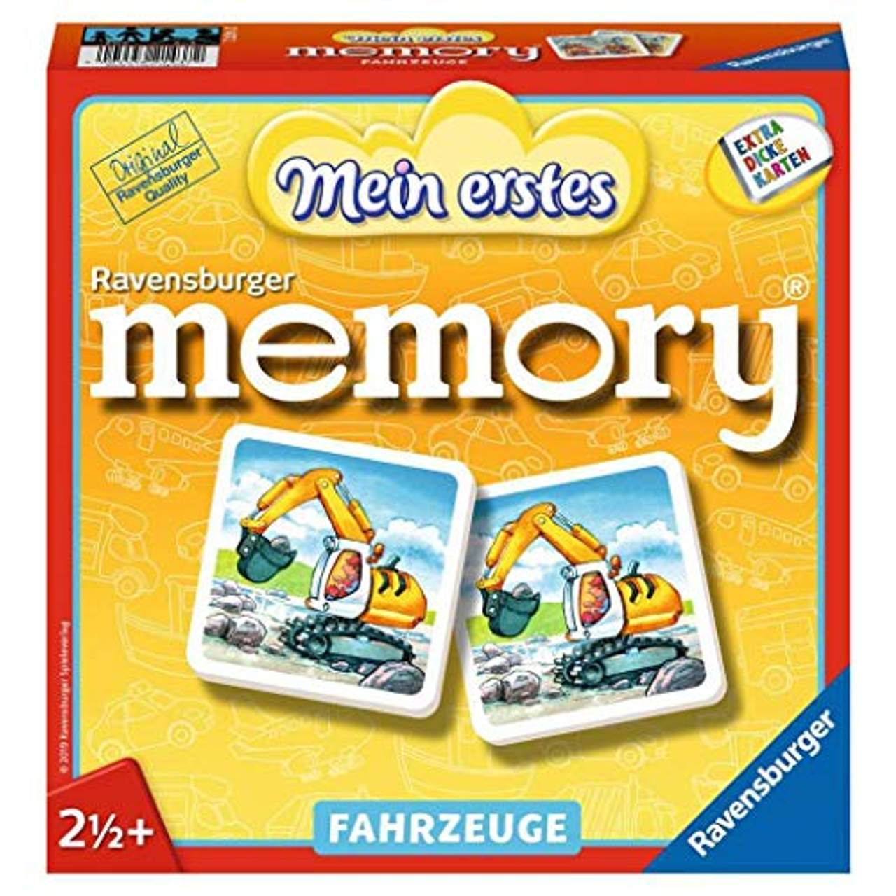 Ravensburger Kinderspiele 21437 Mein erstes memory ist ein Kinderspiel, das für Kinder ab 2 1/2 Jahren geeignet ist. Es besteht aus 24 Karten mit Abbildungen verschiedener Fahrzeuge und einer Anleitung. Die Bildersuche fördert die Konzentration und die Merkfähigkeit. Die Karten sind extradick und haben abgerundete Ecken für die Sicherheit. Ravensburger Kinderspiele 21437 ist ein ideales Geschenk für Geburtstage oder Weihnachten und ein tolles Familienspiel.