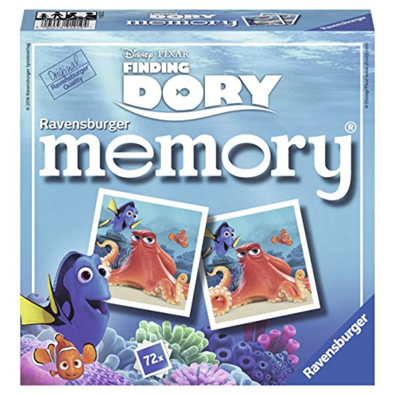 Ravensburger Memory 21219 Dory LegespielDisney/Pixar Finding Dory memory Findet Dorie! … aber auch die bekannten Clownfische Nemo und Marlin, Oktopus Hank, Belugawal Bailey und viele weitere Freunde aus Disney/Pixar’s neuestem Unterwasser-Filmabenteuer. Sie alle tummeln sich als Bildpaare in diesem memory und trainieren das Gedächtnis der Spieler. memory - der beliebte Spieleklassiker mit schönen Motiven der lustigen Fischdame Dorie, ihrem bekannten Freund Nemo, sowie vieler neuer Meerestiere aus dem Kinofilm Findet Dorie!. 72 Karten (36 Bildpaare)