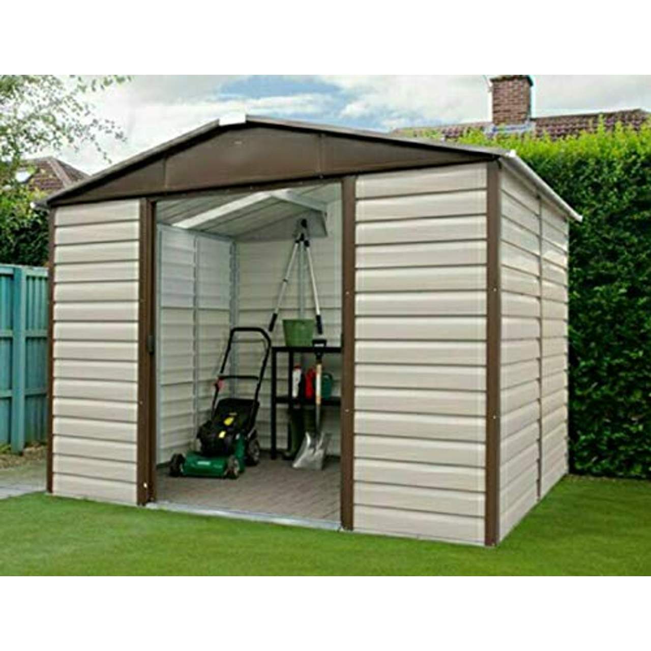 Yardmaster International 1012TBSL Brandenburg GerätehausYardmasters robustes Metallgerätehaus Brandenburg 1012TBSL in der Farbe Taupe mit Brauen Aztenten bietet eine sichere Lösung für die Outdoor-Lagerung Ihrer Gartengeräte, Gartenmöbel, Kinderspielzeug, Fahrräder und andere Besitztümer. Hergestellt aus hochfestem, feuerverzinktem Stahl, wurde Ihr Yardmaster Gerätehaus Brandenburg 1012TBSL mit 7 Schichten Rostschutz und einer eingebrannten Oberflächenbeschichtung behandelt. Somit erfordert das Modell Brandenburg in Taupe keine Wartung außer der gelegentlichen Reinigung. Das intelligente Design bietet Ihnen Dachlüftung-Schlitze für einen erhöhten Luftstrom und überlappende, doppelte Schiebetüren machen es nicht nur einfach, Gegenstände zu lagern, sondern halten diese auch gegen Regen und Schnee optimal geschützt.Zusätzlich bietet Ihnen das Modell Brandeburg 1012TBSL durchsichtige Dachpaneele einen helleren Inneraum und Dachrinnen ermöglichen die Regenwasserableitung und halten die Außenwände sauber. Der extra hohe Giebel mit einer Dachneigung von 17 Grad bietet Ihnen mehr Stehfreiheit und den einfachen Zugang zu Ihren Gartenutensilien und Holzkohlegrill.Wie alle Yardmaster Metall-Gerätehäuser, ist das Modell Brandenburg 1012TBSL für die einfache Selbstmontage konzipiert. Komplett mit Rahmen, Stahlblechpaneelen, rostbeständigen Edelstahlschrauben und einem kostenlosen Ankerbolzen-Set zur Bodenverankerung, können Sie Ihr Gerätehaus mithilfe der gut illustrierte und mehrsprachige Montageanleitung Schritt für Schricht in Ihrem Garten, Schrebergarten oder Campingplatz errichten.Nicht im Lieferumfang enthalten sind Holzbodenplatten und Vorhängeschloss.