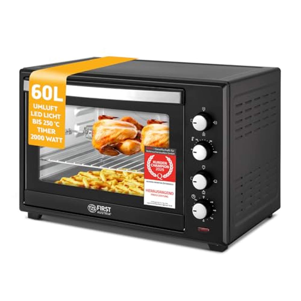 - Großes Fassungsvermögen: Der TZS First Austria FA-5047 60 Liter Mini-Backofen hat ein großes Fassungsvermögen von 60 Litern, so dass zwei Standardpizzen auf einem Rost und mehrere Lebensmittel auf einmal darin Platz finden.