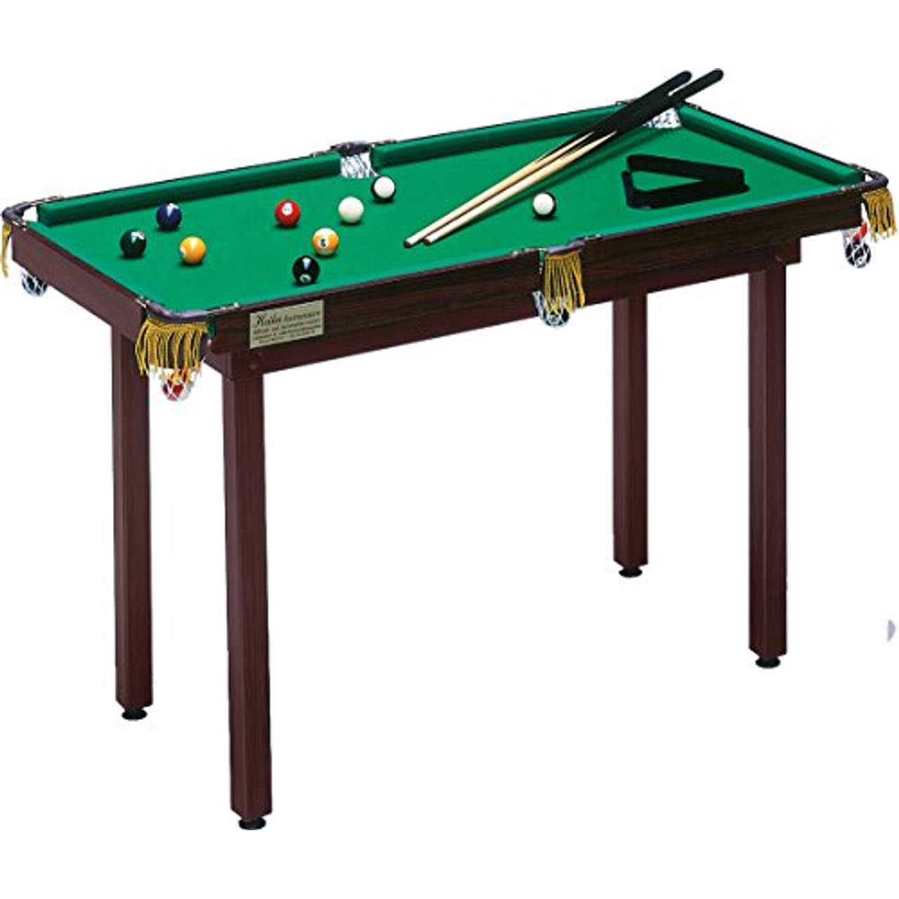 Heiku Billardtisch Sport Mini-PoolSie haben Spaß am Billard aber nicht genug Platz für einen Profi-Tisch? Ihre Kinder möchten gerne das Billardspiel erlernen aber Sie sind sich unsicher wie Lange sie daran Spaß haben könnten und möchten Anfangs höhere Kosten vermeiden?Dann sind unsere Mini-Billard-Tische für Sie genau das Richtige. Durch die kompakte Bauweise finden diese Tische auch in Ihrem Haushalt Platz. Dabei müssen Sie nicht auf die Spannung und das Vergnügen wie bei einem Profi-Tisch verzichten.Die Mini-Billardtische sind voll funktionstüchtig und einfach zu montieren. Die 4 Beine lassen sich mühelos anschrauben. Der Mini-Pool 115 wird komplett mit Zubehör geliefert. Zubehör: 2 Queues 100cm, 16 Kugeln, 38mm, Triangel und Kreide Außenmaß: Länge ca. 123cm, Breite ca. 62cm, Höhe ca. 77cm