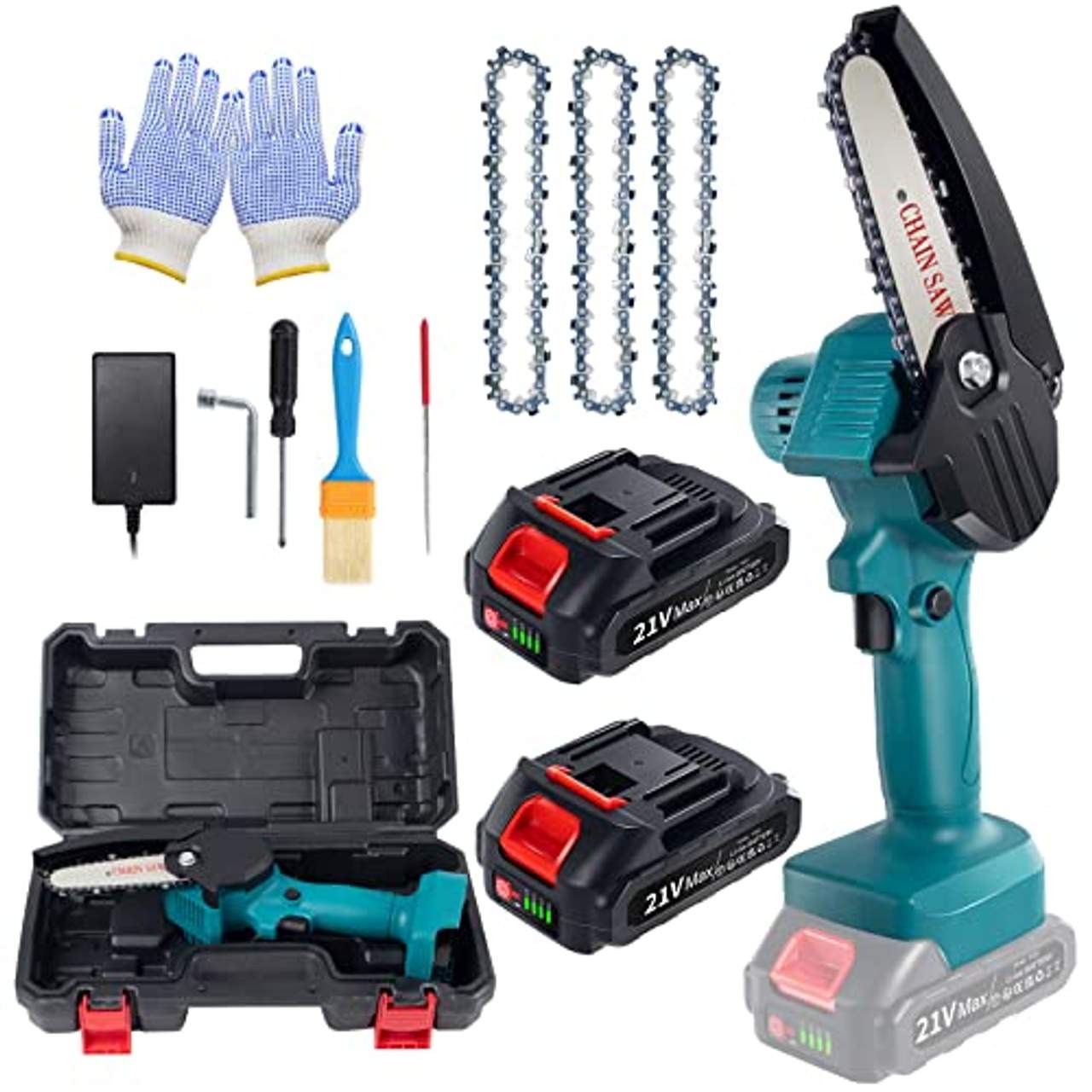 Das Mini-Kettensägen-Set enthält 1 Akku-Kettensäge, 2 Akkus für eine ausreichende Stromversorgung, 3 Ersatzketten, 1 Ladegerät zum Aufladen der Akkus, 1 Schraubendreher für alle notwendigen Einstellungen, 1 Schraubenschlüssel für Wartungsarbeiten, 1 Bedienungsanleitung für die Anleitung und 1 Aufbewahrungsbox für den bequemen Transport und den Einsatz im Freien.