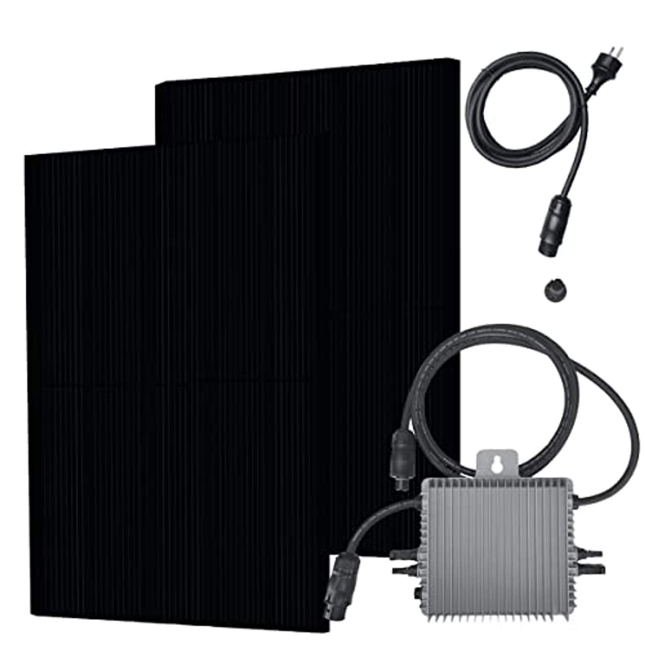 | Lieferumfang | Set besteht aus Wechselrichter inkl. Kabel. Schuko-Stecker für den Anschluss an Ihr Hausnetz - 2 schwarze Solarmodule …mehr |