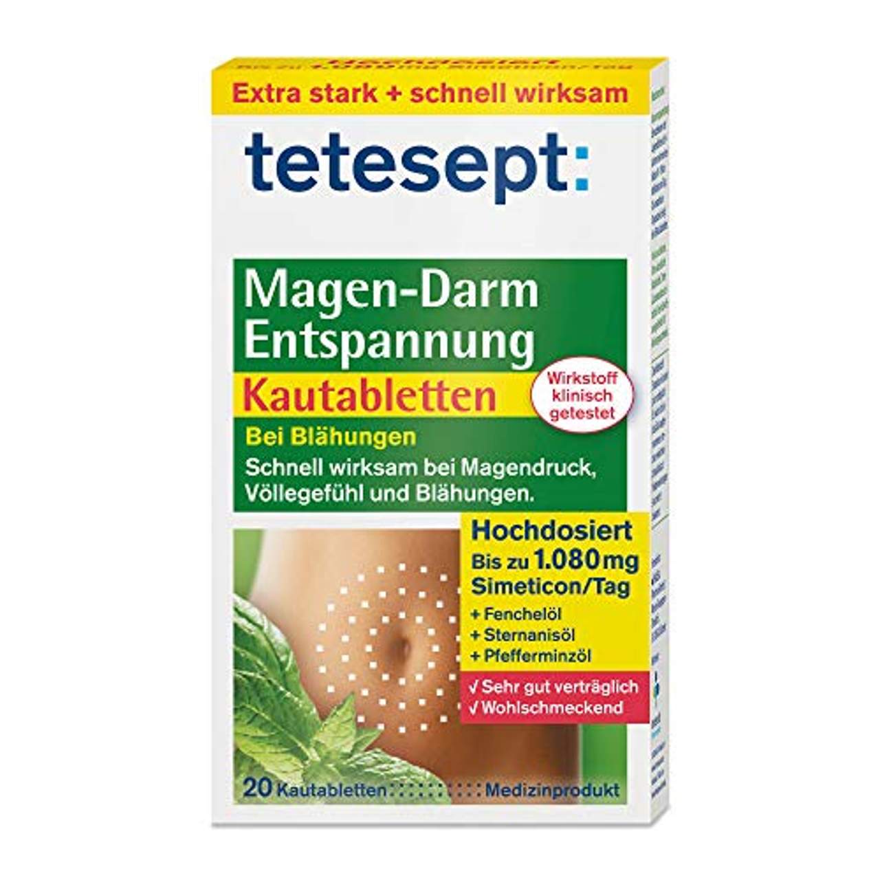 tetesept Magen-Darm Entspannung KautablettenMagen-Darm Entspannung Kautabletten – Schnell wirksam bei Magendruck, Völlegefühl und Blähungen Bei Blähungen, Völlegefühl & Magendruck Lösen unangenehme Gasansammlungen im Bauch auf natürliche Weise auf Lindern gasbedingte Krämpfe, Völlegefühl und Magendruck Hochdosiert – bis zu 810 mg Simeticon pro Tag Sehr gut verträglich und unbedenklich Kein Gewöhnungseffekt Frei von Laktose, ohne künstliche Farbstoffe und Zuckeraustauschstoffe Mit Kräutergeschmack tetesept Magen-Darm Entspannung Kautabletten sind schnell und zuverlässig wirksam bei Blähungen, Magendruck- und Völlegefühl.Sie haben eine hochdosierte Rezeptur: Durch das Kauen der Kautablette wird der hochdosierte, medizinische Wirkstoff bereits im Mund freigesetzt und ist sofort für den Organismus verfügbar. Blähungen entstehen, wenn im Darm durch den Verdauungsprozess verstärkt Gase freigesetzt werden.Diese „Luft im Bauch“ verursacht häufig unangenehme Beschwerden und Schmerzen und beeinträchtigt das Wohlbefinden. Ursache hierfür sind blähende Lebensmittel, zu große Essensmengen, Stress oder mangelnde Bewegung. Die Folgen: Spannungs- und Druckgefühl im Bauchraum, Krämpfe und Blähungen.tetesept Magen-Darm Entspannung Kautabletten - die schnellen Helfer bei Blähungen.