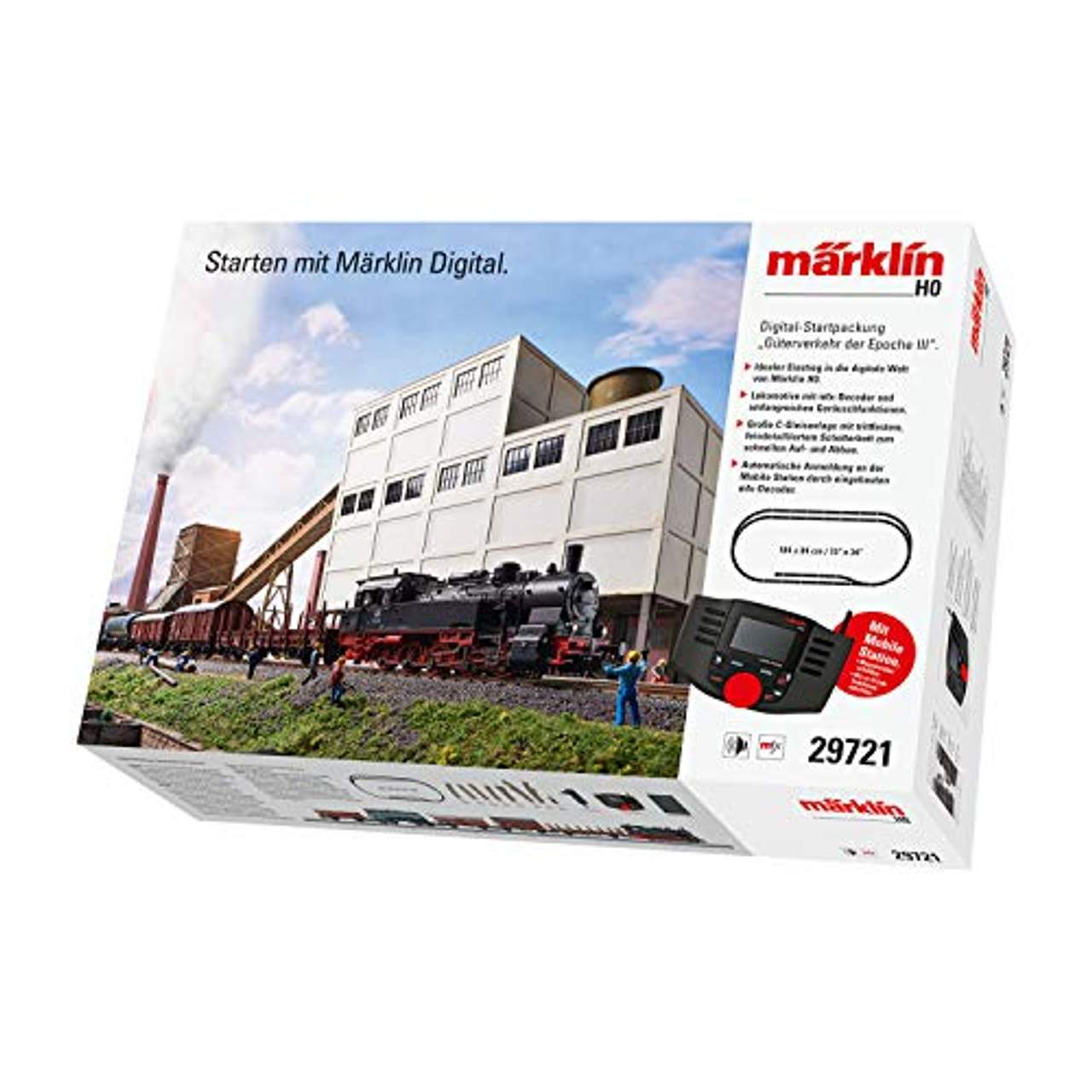 Märklin 29721 Güterverkehr III digital-Startpackung PersonenzugMärklin Einsteigerset, Spur H0, »Digitale Startpackung Güterverkehr, Wechselstrom - 29721«. Dieses Starterset erleichtert Modellbaufans den Einstieg in die Miniaturwelt der Eisenbahnen! Die Tenderlokomotive aus der Baureihe 94 wurde seinem Vorbild detailgetreu nachgebaut. Ein zusätzlicher Rungenwagen, ein gedeckter Güterwagen, ein Schiebedachwagen, ein Hochboardwagen, ein vierachsiger Kesselwagen mit Bremserbühne sowie ein Privatwagen der EVA sorgen für Spannung und Spaß.Der Hochleistungsantrieb mit Schwungmasse lässt die Lok noch authentischer wirken. Das Fahrtrichtungsabhängig wechselnde Dreilicht-Spitzensignal ist digital schaltbar. Die LED-Beleuchtung und die zahlreichen Gleismaterialien runden dieses Einsteigerset optimal ab. Details:: Spur: H0, Epoche: III, Bahnverwaltung: Deutsche Bahn AG, Stromsystem:Wechselstrom, Für digitale Systeme, Mit Schwungmasse, Antrieb über 5 Achsen, Haftreifen, LED-Beleuchtung, Stirn- und Schlusslampen mit Fahrtrichtung wechselnd, Beleuchtung digital schaltbar, Länge des Zuges: ca. 77 cm, B/H Oval: ca. 184/84 cm. Inhalt:: 1 Tenderlokomotive Baureihe 94, 1 Rungenwagen RImms, 1 gedeckter Güterwagen Gms 30, 1 Schiebedachwagen Kmmks 51, 1 Hochboardwagen Om 12, 1 vierachsiger Kesselwagen, 1 Privatwagen der EVA, 14 gebogene Gleise 24130, 9 gerade Gleise (ca. 19 cm), 11 gerade Gleise (ca. 17 cm), 1 gebogenes Gleis 24224, 1 Weiche rechts 24612, 1 Bogenweiche links 24671, 1 Bogenweiche rechts 24672, 1 Prellblock 24977, Gleisanschlussbox, Schaltnetzteil 36 VA/230 V, Mobile Station, Kolbstangenschutzrohre und Bremsschläuche, Illustriertes Spielbuch mit Tipps und Anregungen . Altersempfehlung ab 15 Jahren Warnhinweis:: Dieses Modell ist für Sammler gedacht. Nicht für Kinder unter 15 Jahren geeignet. Beinhaltet Kleinteile. Die Adresse bitte für spätere Zwecke aufbewahren.