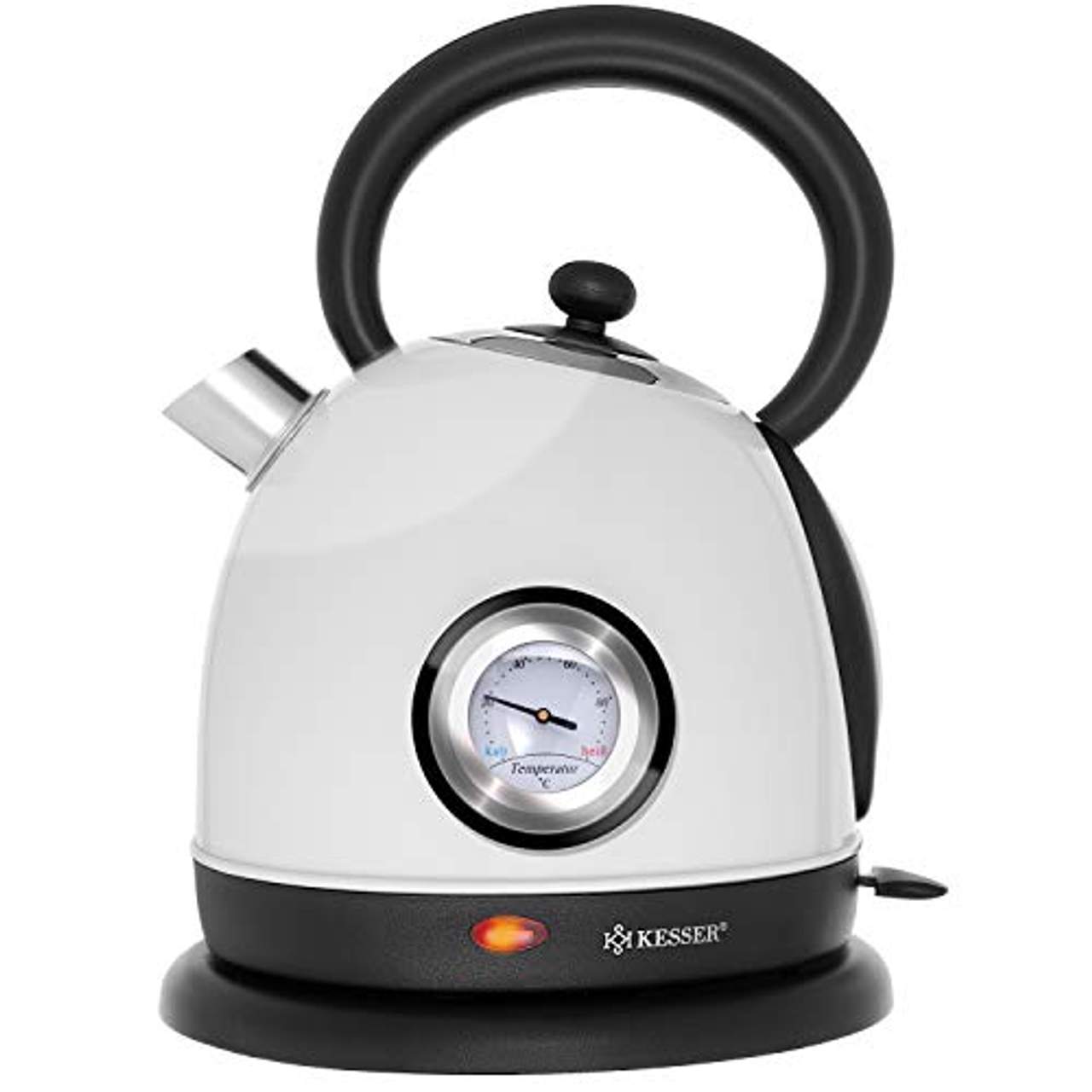 Retro-Wasserkocher kabellos Kapazität: 1,8 Liter integriertes Thermometer automatische Abschaltung herausnehmbarer Antikalk-Filter 360°-Drehbasis für Rechts- und Linkshänder Ein/Ausschalter-Taste Wasserstandsanzeige Basisstation mit Kabelaufwicklung verdecktes Heizelement aus Edelstahl ergonomisch geformter Griff Leistung: 2200 WattTechnische Daten: