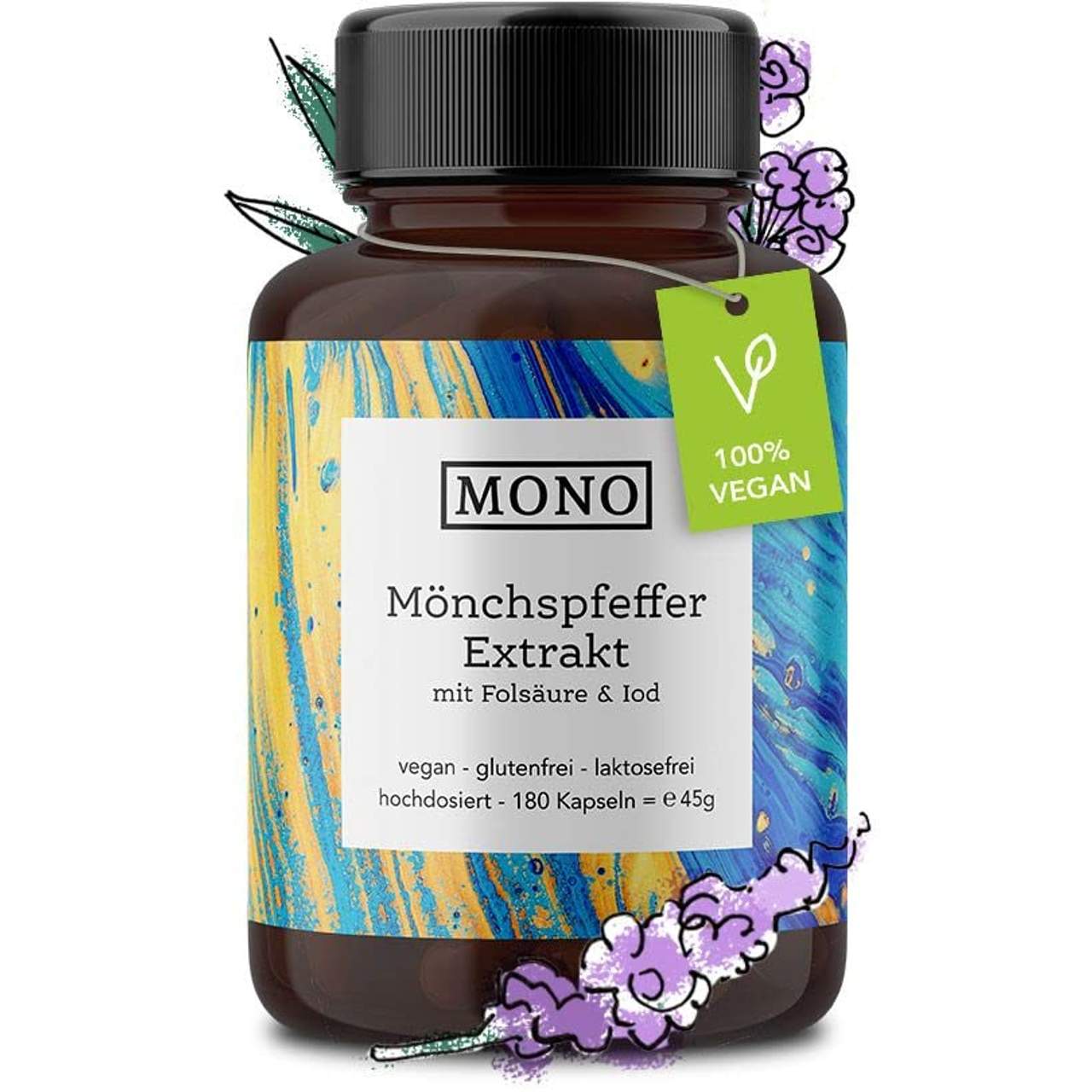 MONO Mönchspfeffer Kapseln 4:1Vitamine für Frauen: Mönchspfeffer mit Folsäure Der hochdosierte Mönchspfeffer Premium Extrakt wird im 4:1 Extraktionsverhältnis mit je 10mg Mönchspfeffer je Kapsel in Deutschland hergestellt. Hochwertiges veganes Leinsamenmehl dient als Trägerstoff des hochdosierten Mönchspfeffer Extraktes (Vitex Agnus Castus).Ergänzt wird der Pflanzenstoffkomplex mit Vitamin B9, Folsäure und Iod. Leichte Anwendung: Nehmen Sie 1x täglich eine Kapsel Mönchspfeffer hochdosiert mit ausreichend Flüssigkeit ein. Die Packung enthält 180 Kapseln Mönchspfeffer Premium Extrakt für 6 Monate.