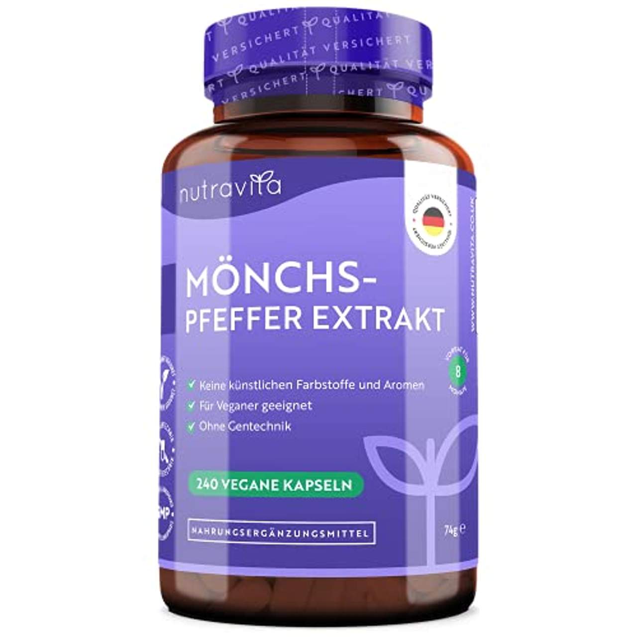 Nutravita Mönchspfeffer-Kapseln High Dose ist ein veganes Nahrungsergänzungsmittel aus der Frucht des Mönchspfefferbaums. Jede Flasche enthält 25mg-Kapseln, die leicht zu schlucken sind, und einen Vorrat für 8 Monate. Das Produkt ist gentechnikfrei, allergenfrei und wird in Deutschland unter hohen Produktions- und Hygienestandards hergestellt. Nutravita versorgt Kunden seit 2014 mit Vitaminen und Nahrungsergänzungsmitteln und jedes Produkt ist nach GMP, BRC und anderen internationalen Standards qualitätszertifiziert.
