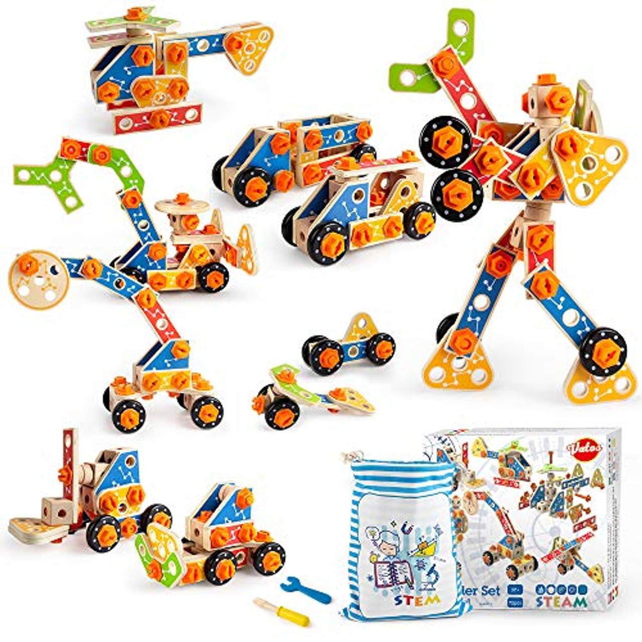 VATOS Holz Konstruktionsspielzeug Pädagogisches Montessori Spielzeug ist ein Holzkonstruktionsspielzeug für Kinder im Alter von 3 bis 10 Jahren. Es besteht aus 72 Teilen, die miteinander verbunden werden können, um Modelle wie Roboter, Hubschrauber, Gabelstapler oder Kräne zu bauen und so die Hand-Augen-Koordination und die kognitiven Fähigkeiten der Kinder zu verbessern. Das Material ist BPA-frei, ungiftig und 100% sicher. Es fördert außerdem die Kreativität, das logische Denken und die Problemlösung der Kinder und vermittelt ihnen die Bedeutung von Teamarbeit. Es ist ein hervorragendes, das Gehirn stimulierendes Spielzeug und eine tolle Geschenkidee für Geburtstage oder Weihnachten.