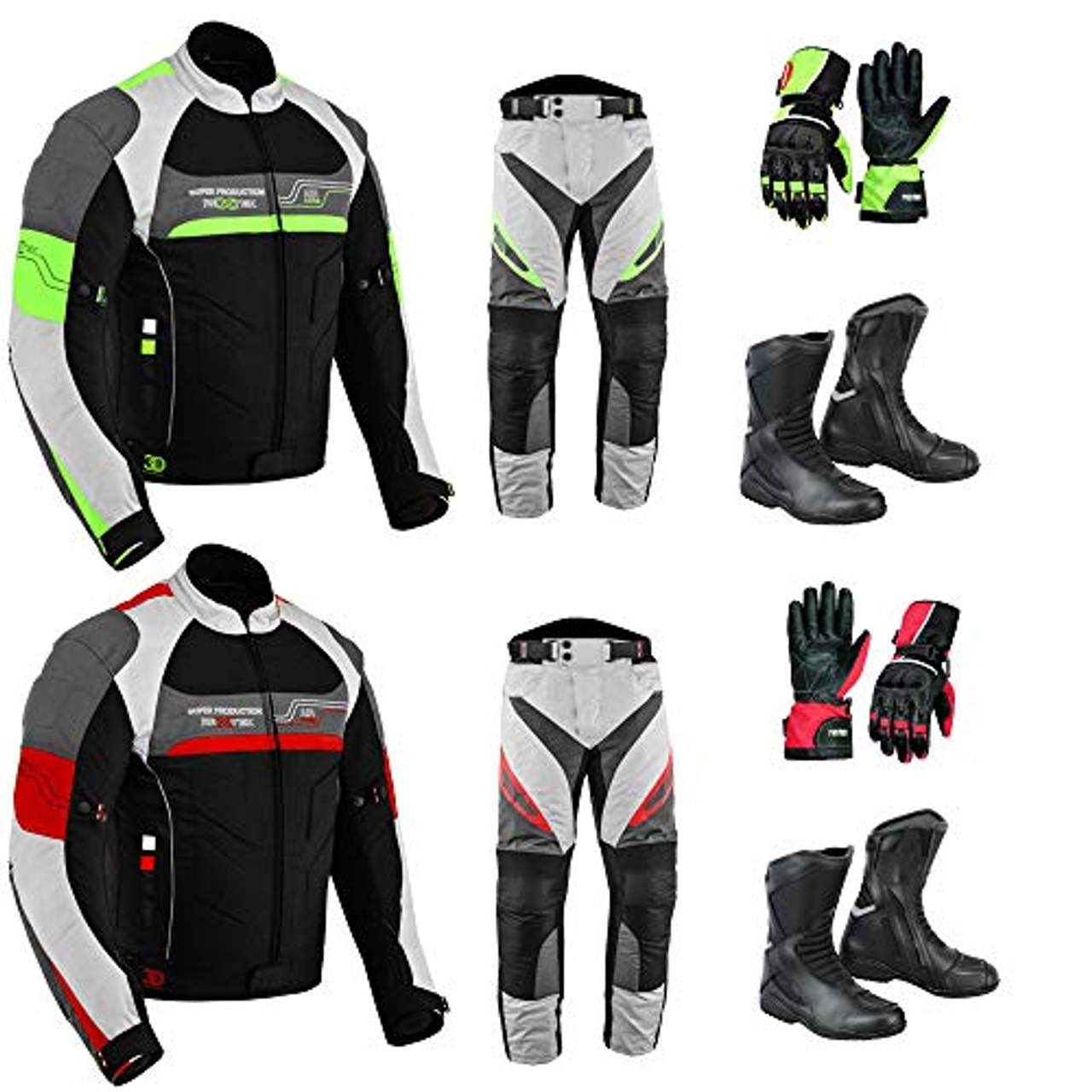 Der Motorradanzug Wasserdichter Motorrad Moped ist ein umfassender Motorradanzug, der auf Langlebigkeit und Komfort ausgelegt ist. Er besteht aus 600D Cordura-Gewebe, das wasserdichten Schutz gewährleistet. Der Anzug verfügt über eine verstärkte Konstruktion mit fast allen Nähten, die genäht wurden, um ein Reißen zu verhindern, sowie über Barteck-Nähte an den Reißverschlussecken, um die Langlebigkeit zu erhöhen. Die Jacke hat verstellbare Arme, mehrere Taschen und reflektierende Einsätze für mehr Sicherheit, während das herausnehmbare Steppfutter für Anpassungsfähigkeit bei verschiedenen Wetterbedingungen sorgt. Die Hose ist mit CE-geprüften Schutzvorrichtungen, einem elastischen Material für zusätzlichen Komfort und wasserdichten Reißverschlüssen an beiden Beinen ausgestattet. Außerdem enthält das Set wasserdichte Handschuhe aus Rindsleder und Cordura-Gewebe, die einen Knöchelschutz aus Carbon und eine Wärmeisolierung bieten. Die hochwertigen Stiefel schließlich bestehen aus Spaltleder mit wasserdichter Laminierung und hartem Schutz an kritischen Stellen, um die Sicherheit während der Fahrt zu erhöhen. Dieses Ensemble vereint Funktion, Komfort und Sicherheit und ist für Motorradfahrer und Outdoor-Enthusiasten gleichermaßen geeignet.