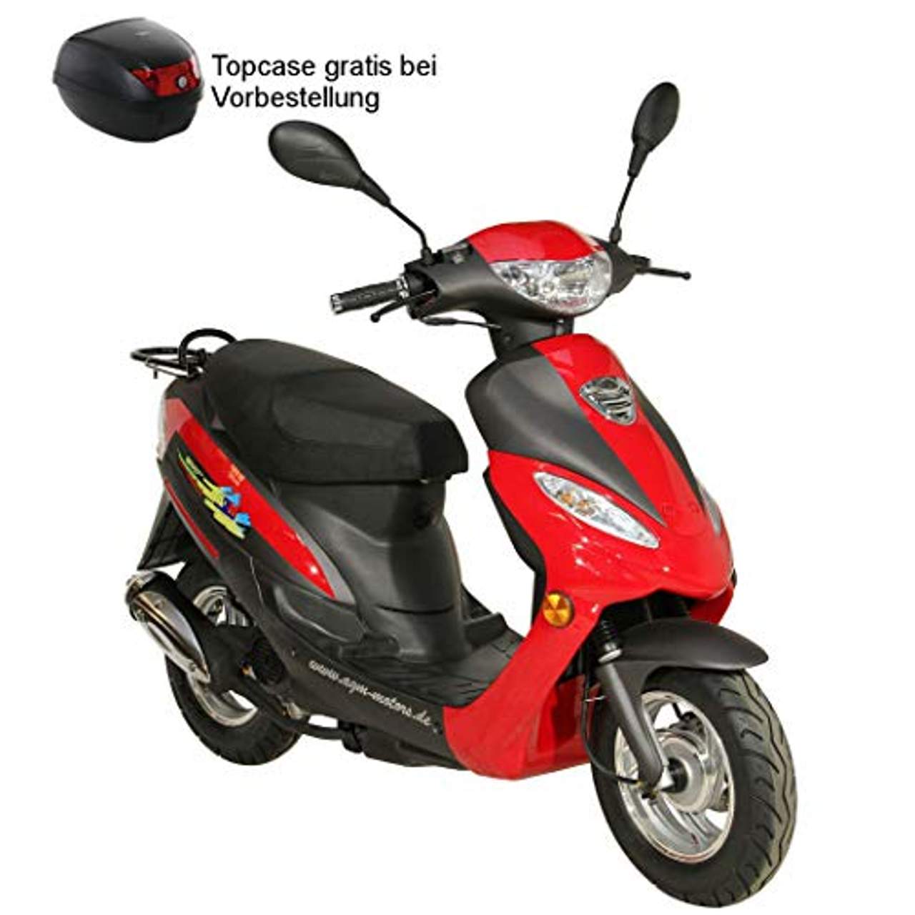 Roller GMX 450 Mokick 45 KM/H ROT 2,4 KWAGM GMX 450 - Sparsamer 4-Takt Motorroller mit 45 km/hBei Sofortbestellung erhalten Sie zum Motorroller kostenlos ein Topcase dazu.Motorroller, AGM-Motors GMX 450 mit Alu Felgen, wartungsfreier Markenbatterie 12Volt / 6AH, Markenreifen, Markenzündkerze, Markenkeilriemen, durchsichtigen Blinkergläsern, Automatikgetriebe und sportlichem Look. Er wird von einem kraftvollen und sparsamen 50ccm 4-Taktmotor mit 3,3 PS angetrieben, der auf eine Geschwindigkeit von 45 km/h beschleunigt. Auch sportliche Fahrer werden zuverlässig durch die Scheibenbremse (2 Kolbenbremszange mit Stahlflexbremsleitung) vorne und die Trommelbremse hinten eingebremst. Mit dem serienmäßigen Gepäckträger und dem Staufach unter dem Lenker sowie unter der Sitzbank ist der Roller ideal für den täglichen Einsatz gerüstet. Haupt- und Seitenständer, ein 5 Liter Tank (Normalbenzin, bleifrei) mit Tankanzeige im Cockpit sowie Elektro- und Kickstarter runden das tolle Angebot ab. Besonders umweltschonend mit Euro 4 Norm und Katalysator.Garantierte Ersatzteilversorgung (Lager in Deutschland).