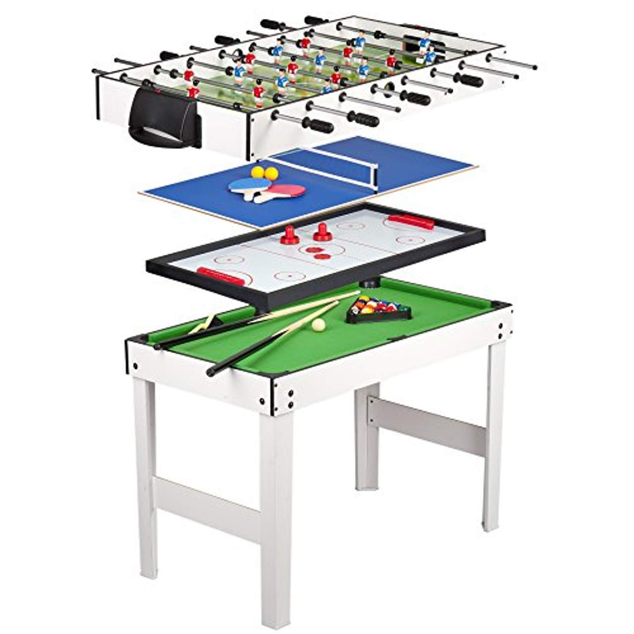 - All-in-One-Unterhaltung: Dieser multifunktionale Spieltisch bietet eine Reihe von Unterhaltungsmöglichkeiten, darunter Tischfußball, Billard, Airfield Hockey und Tischtennis. Das macht ihn zur idealen Wahl für Familienfeiern oder Partys.