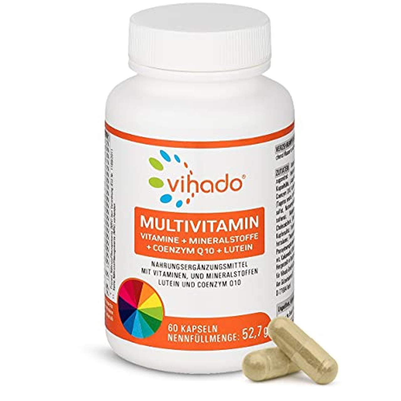 Vihado Multivitamin Vitamine A-Z und Multimineral-KomplexVitamin A-Z: Der Vitamin- und Mineralstoffkomplex der Multivitamin Kapseln enthält Vitamine, Mineralien und Spurenelemente zur Unterstützung wichtiger Körperfunktionen. Abgestimmte Formel: Die Vitamine werden ergänzt durch Mineralstoffe und Spurenelemente (z. B. Kupfer, Selen), die u. a. zu einer normalen Funktion des Immunsystems beitragen.Pflanzliche Kapselhülle: Inhalt und Hülle der Kapseln sind komplett vegan und leicht zu schlucken, zudem lässt sich die kleine Kapsel öffnen für eine noch leichtere Einnahme. Hohe Bioverfügbarkeit: Dank der hohen Bioverfügbarkeit der Vitamine und Mineralstoffe bietet das Vitaminpräparat eine umfassende Komplettversorgung mit nur 1 Kapsel am Tag. Lieferumfang: 1x Vihado Multivitamin, Vitamin- und Mineralstoffkomplex mit Coenzym Q10 und Lutein, Nahrungsergänzungsmittel mit hochdosierter Formel, 60 Kapseln (52,7g)