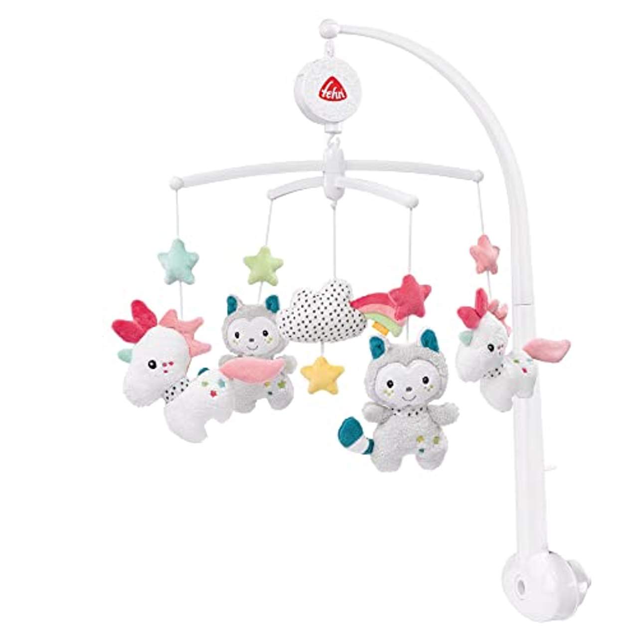 Fehn Musik Mobile Aiko & YukiProduktdetails: Alter: ab 0 Monaten Spieluhr-Mobile mit niedlichen Figuren zum Beobachten, Lauschen & Staunen – Zum Befestigen am Bett Das Figuren-Mobile aus der Aiko & Yuki Kollektion wird Babyaugen zum Leuchten bringen Die kleinen Einhörner und Katzen sorgen tagsüber für Spielspaß und sind abends treue Einschlafhelfer Die knalligen Farben und interessanten Strukturen fesseln die Aufmerksamkeit des Babys und erwecken die Fantasie Die beliebte Melodie der mechanischen Spieluhr lässt die Figuren tanzen und regt das Baby zum Lauschen an In ruhigen Minuten lässt sie sich dank des An/Aus-Schalters abstellen Das Mobile wird ganz einfach am Babybett befestigt und ist damit ein süßer Hingucker im Kinderzimmer Ideal als Geschenk zur Geburt, Taufe oder als Geburtstagsgeschenk für Babys und Kleinkinder Spieluhrmelodie variiert, mögliche Melodien sind:Brahms Wiegenlied, Mozarts Wiegenlied, Schuberts Wiegenlied, Guter Mond, Schlaf Kindlein Schlaf, Weißt du wie viel Sternlein stehen, Schwanensee, Dodo l’enfant, Der Mond ist aufgegangen Maße & Gewicht: Maße: Höhe: 65 cm, Ø 40 cm Material & Pflege: Material: Softvelours, Plüsch, Stoff Pflegehinweis: Figuren waschbar bei 30 °C Warn- & Sicherheitshinweise: Achtung: Um mögliche Verletzungen durch verheddern zu verhindern, ist dieses Spielzeug zu entfernen, wenn das Kind beginnt zu versuchen, auf allen Vieren zu krabbeln.