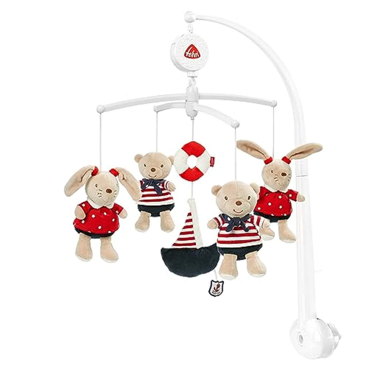 Fehn Musik Mobile Ocean ClubProduktdetails: Alter: ab 0 Monaten Das Musik-Mobile aus der Kollektion Ocean Club wird das Herz deines Babys im Nu erobern Der knuddelige Teddy und das süße Häschen begeben sich mit ihrem Boot auf hohe See und nehmen dein Baby dabei mit ins Land der Träume Die mechanische Spieluhr mit An-/Ausschalter lässt die Figuren tanzen und wiegt dein Baby mit einer beliebten Schlafliedmelodie sanft in den Schlaf Tagsüber wecken die tanzenden Teddys und Hasen Babys Neugier und laden zum Lauschen, Beobachten und Staunen ein Bunte Stoffe im typischen gestreiften und gepunkteten Matrosenlook regen Babys Wahrnehmung an Zum Spielen und Waschen lassen sich die Figuren ganz leicht abnehmen Das Mobilegestänge im zeitlosen Design erlaubt eine einfache Befestigung Reinigung:Normalwaschgang 30 °C Maße & Gewicht: Maße: Ø 40 cm Warn- & Sicherheitshinweise: Achtung: Eine Melodieauswahl ist nicht möglich. Mobiles sind kein Spielzeug! Es dient nur der optischen Stimulation und muss aufgrund von Erstickungsgefahr durch verschluckbare Kleinteile stets außerhalb der Reichweite des Kindes befestigt werden.