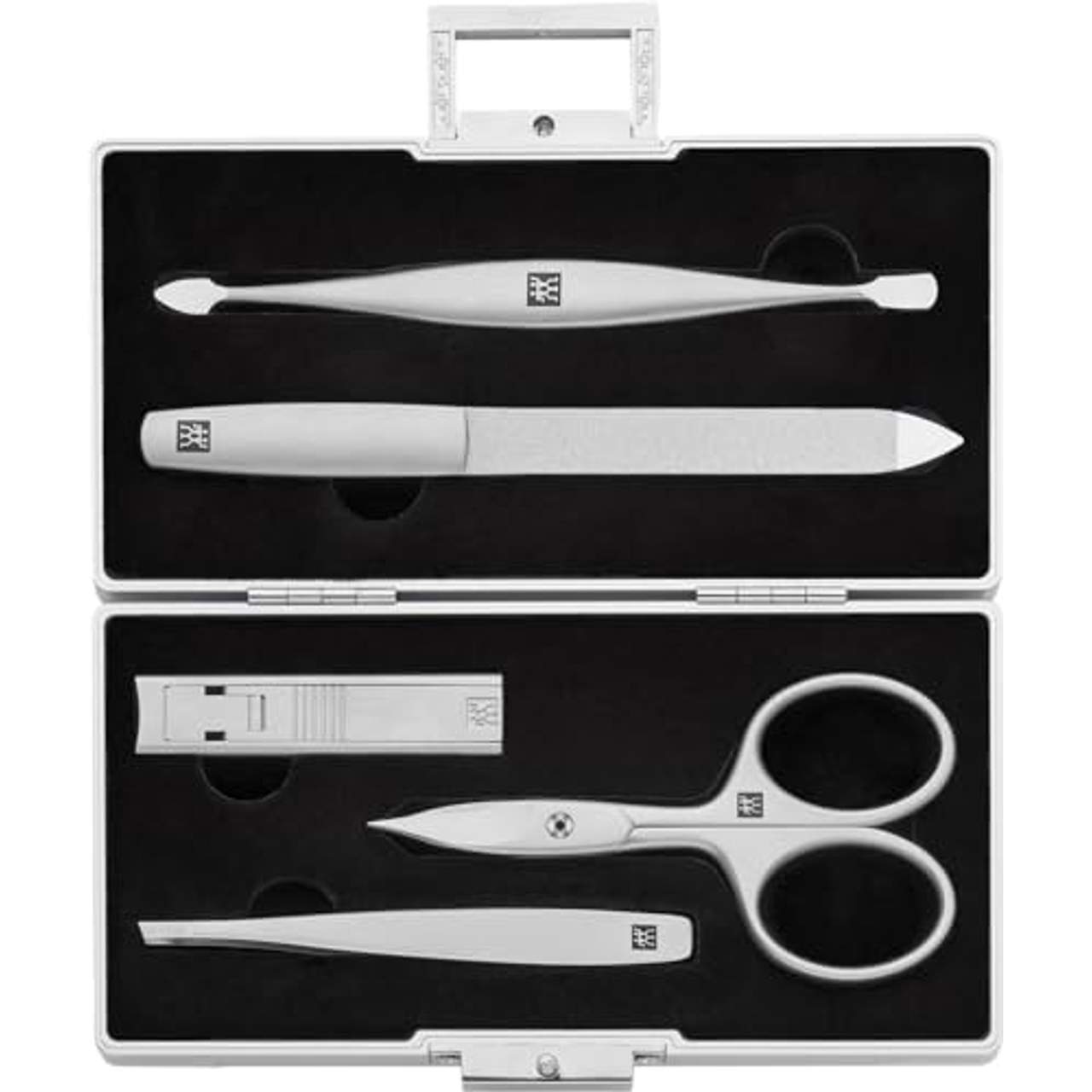 Das ZWILLING TWINOX Maniküre-Set enthält insgesamt fünf wichtige Teile, darunter eine 2-in-1-Kombinationsnagelschere, eine Pinzette, ein 2-in-1-Doppelinstrument, einen TWIN S-Nagelknipser und eine Saphirnagelfeile.