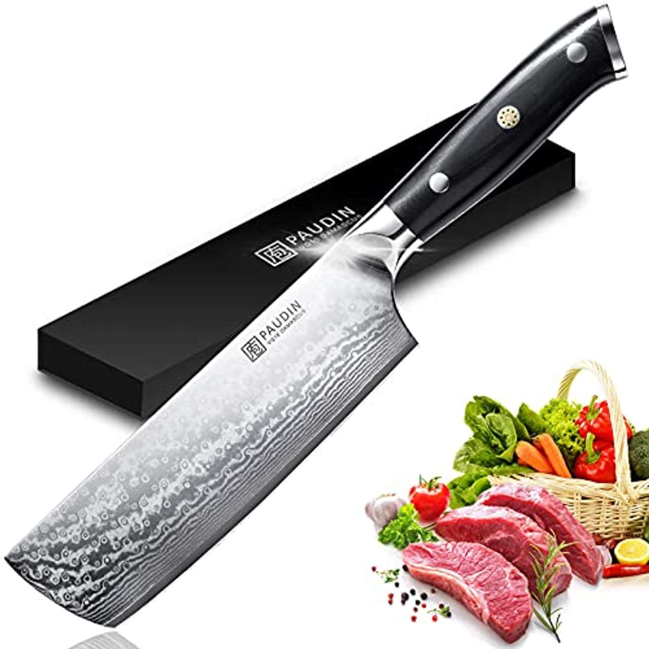 - Legendäre Leistung: Das PAUDIN Damastmesser Nakirimesser 17cm ist ein professionelles Küchenmesser, das aus hochwertigem Damaststahl geschmiedet wurde, der ihm eine hervorragende Schärfe und einen minimalen Schnittwiderstand verleiht. Dieses Messer macht das Schneiden von Gemüse, Obst, Fleisch und sogar ganzen Hähnchen effizienter und verbessert Ihr Kocherlebnis.