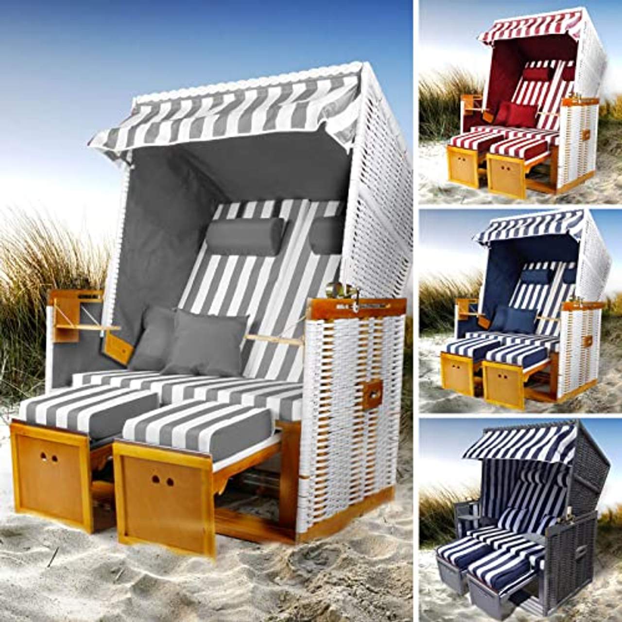 - Komfort und Luxus: Dieser Strandkorb wird mit zwei zusätzlichen Fußstützenkissen für zusätzlichen Komfort sowie zwei Nackenkissen und zwei Komfort-Rückenkissen geliefert. Die Rückenlehne lässt sich in vier Stufen bis zur vollen Liegeposition verstellen.