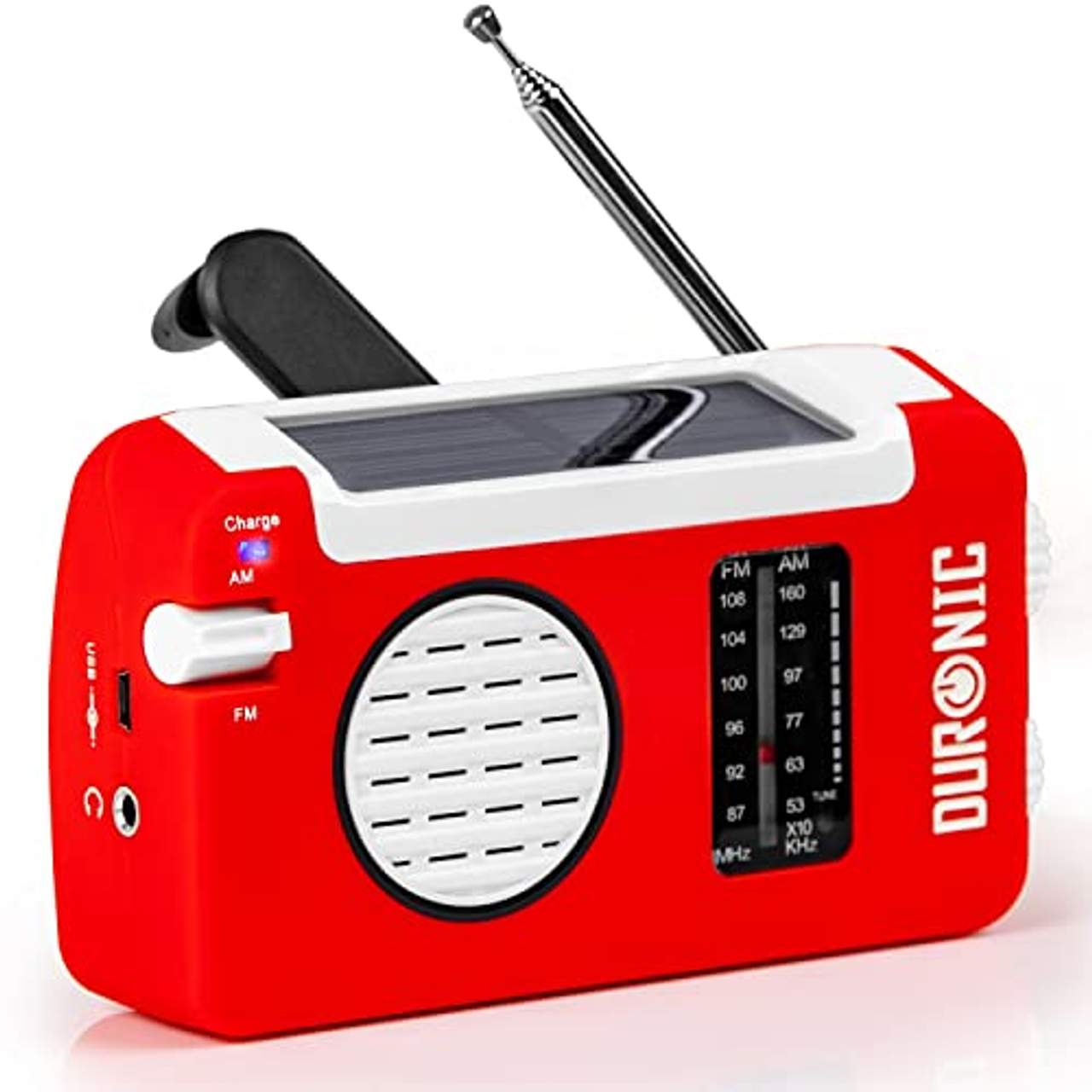 Duronic Hybrid Radio AM FMDas Duronic Hybrid Radio ist ein einzigartig tragbares AM / FM Radio mit integriertem 300 mAh Batterieladegerät. Die eingebaute Batterie wird dank der Dynamokurbel, der Sonnenkollektoren oder des USB (Kabel wird mitgeliefert) aufgeladen. Dieses Outdoor Radio ist der perfekte Begleiter für Ihre Wanderungen, Picknicks, Camping Ausflüge aber auch für Ihr Zuhause und Ihren Garten sowie Werkstatt.Die Dynamo-Kurbel ermöglicht es, die notwendige Energie für den Betrieb des Radios zu erzeugen und zu speichern.Eine Minute Wiederaufladung pro Handkurbel ergeben ca. 20 Minuten des Hörens. Wenn Sie das Gerät für 8 Stunden an einen USB-Anschluss anschließen, können Sie ca. 7 Stunden Radio hören. Eine 5 Stunden Sonnenbestrahlung erlaubt eine 30-minütige Hörzeit. Mit dem Solarpanel über dem Radio können Sie das Radio gleichzeitig laden und benutzen.Duronic Hybrid Radio unterhält Sie nicht nur bei Ihren Freizeitaktivitäten wie Camping, Picknick oder Wandern, sondern ist auch der beste Begleiter, wenn es zu Gefahrensituationen wie Unwettern kommt und als Notfall-Radio agieren soll.Weiters ist es durch die Solar- bzw. Kurbelaufladung umweltschonender als Radios mit normalen Batteriebetrieb.Eine Leuchtanzeige zeigt den Status der Batterie an. Die AM / FM-Frequenzen werden über den Regler eingestellt und auf dem Display angezeigt, so dass die richtige Frequenz leicht zu finden ist. Die Teleskopantenne ermöglicht einen besseren Empfang des Radios, auch in schwierigen Umgebungen. Die Batterieanzeige leuchtet rot auf, wenn der Akku wieder manuell oder durch Sonnenergie aufzuladen ist.Mit dem Kopfhöreranschluss können Sie auch privat Ihren Lieblingssender hören.Durch die kompakte Größe, das clevere Design und Gewicht von nur 203 Gramm ist dieses Radio sehr raffiniert sowie elegant gebaut und daher sehr leicht tragbar und nimmt im Rucksack nicht viel Platz ein. Dieses raffinierte Outdoor Radio versorgt Sie auch unterwegs mit Ihrem Lieblingsradiosender und ist auch als Kurbelradio sowie Solarradio anwendbar.",
