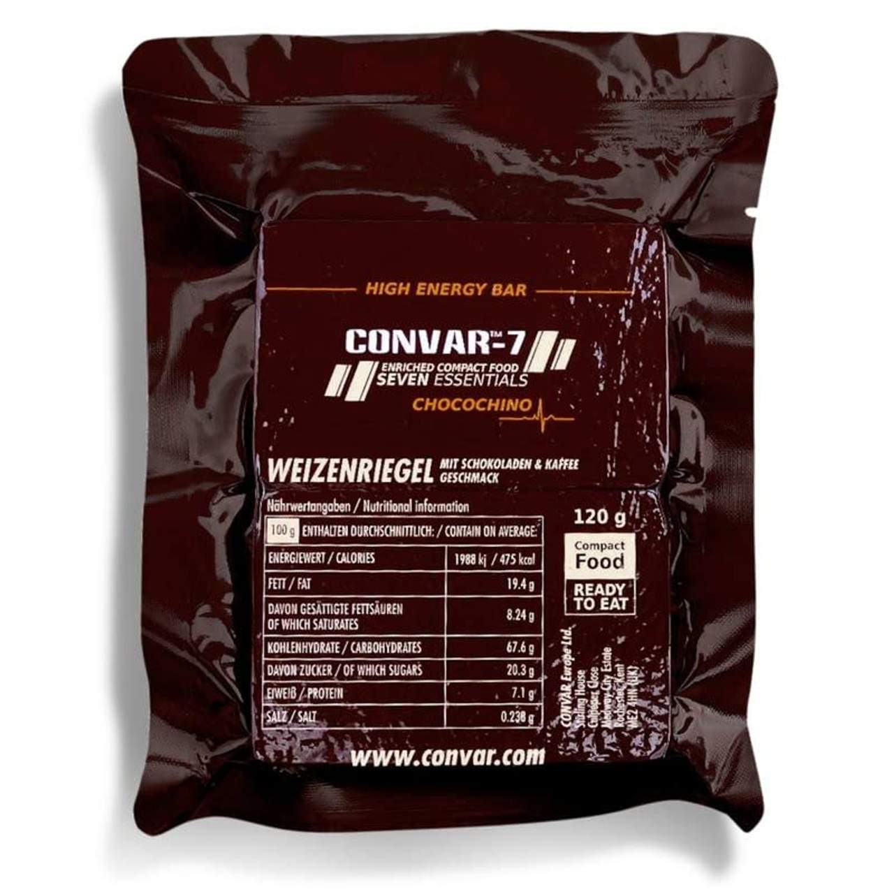CONVAR CONVAR-7 High Energy Bar Chocochino ist ein Lebensmittelprodukt der Marke CONVAR. Er ist in den Geschmacksrichtungen Schokolade und Cappuccino erhältlich, kann ohne Wasser verzehrt werden, ist 15 Jahre haltbar und bietet 2 Portionen für die Notversorgung. Er ist ideal für Extremsituationen wie harte Arbeit, Sport oder Katastrophenhilfe und kann auch als Brei für Kinder ab 6 Monaten zubereitet werden. Die Riegel haben Taschenformat und passen leicht in Rucksäcke, so dass sie sich hervorragend für Outdoor-Aktivitäten und Sport eignen.