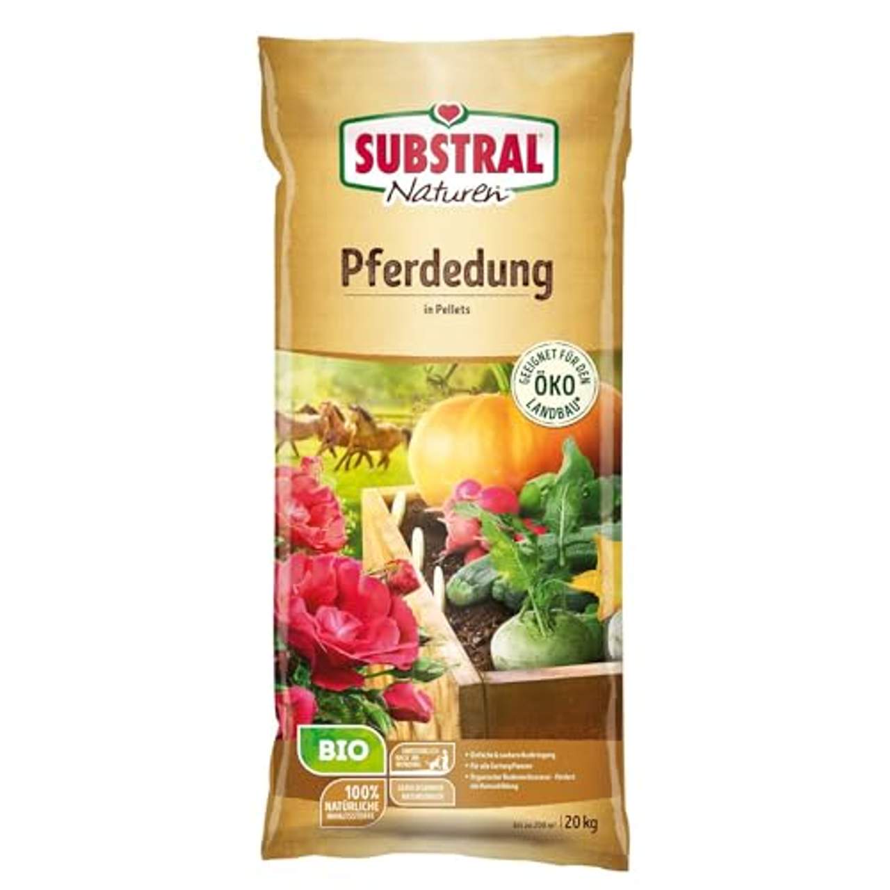Substral Naturen Bio PferdedungBeschreibung Naturen Bio Pferdedung ist ein anwendungsfertiger Stallmist in Pellets. Durch seinen hohen Anteil an organischer Substanz und seine milde Düngewirkung ist der Pferdedung auch als Bodenaufbereiter und Startdünger bei der Neuanlage von Beeten, unter anderem auch Hochbeeten, bestens geeignet.Auch für Rasenflächen und bestehende Pflanzungen. Gebrauchsanleitung Anwendungszeit: Februar - Oktober Die entsprechende Menge gleichmäßig auf der Pflanzfläche verteilen. Anschließend oberflächlich, ca. 5 cm tief mit einer Gartenhacke oder einem Rechen in die Erde einarbeiten. Anschließend gut wässern. Auf Rasenfläche die Pellets gleichmäßig verteilen und anschließend die Fläche gut wässern. Vermeiden Sie das Mähen für ca. eine Woche.Inhaltsstoffe Organischer Volldünger. Chloridarm. 65 % organische Substanz i.d.TS. Pferdemist, pelletiert, 2-2-2 Während einer kurzen Übergangsphase gibt es von diesem Artikel 2 verschiedene Verpackungsdesigns. Der Inhalt und die Qualität sind identisch.