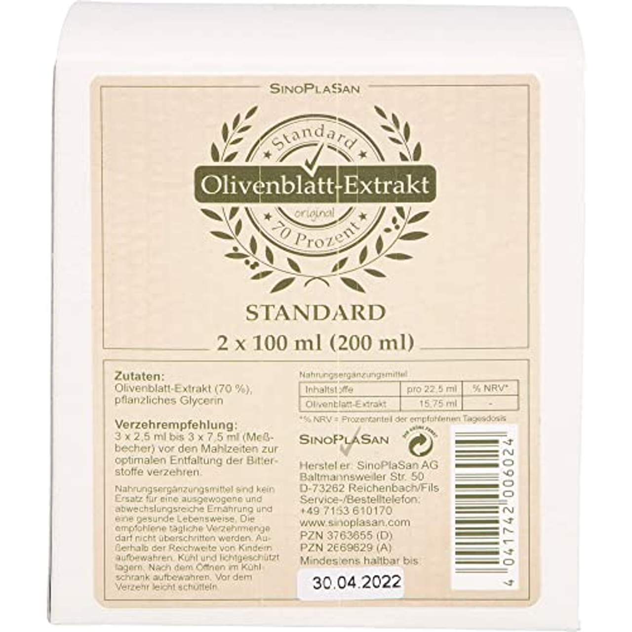 olivenblatt extrakt doppelpack 2X100 mlProdukteigenschaften:Bezeichnung:NahrungsergänzungsmittelVerwendung/Anwendung/Verzehrempfehlung:3 x 2,5 ml bis 3 x 7,5 ml (Messbecher) vor den Mahlzeiten zur optimalen Entfaltung der Bitterstoffe verzehren.Nährwertdeklaration:Inhaltsstoffepro 22,5 ml% NRV*Olivenblatt–Extrakt15,75 ml–* % NRV = Prozentanteil der empfohlenen TagesdosisZutaten:Olivenblattextrakt (70%), Glycerin*.*Das Glycerin wird aus Kokosnüssen gewonnen.Nettofüllmenge:2 x 100 ml.Aufbewahrungsbedingungen:Kühl und lichtgeschützt lagern. Nach dem Öffnen im Kühlschrank aufbewahren. Vor dem Verzehr leicht schütteln.Ursprungsland des Lebensmittels:DeutschlandAnschrift des Herstellers:SinoPlaSan AGKrapfenreuter Straße 473066 UhingenDie für unser Olivenblattextrakt verwendeten Blätter, werden gezielt kurz vor der Blüte des Olivenbaums manuell geerntet und frisch - sofort nach der Ernte - in einem schonenden Verfahren extrahiert. So bleiben alle Inhaltsstoffe aus dem Blatt enthalten. Zu den Hauptinhaltsstoffen von Olivenblattextrakt zählen: Oleuropein, Phenole, Flavonoide. Wir verwenden für unsere flüssigen Olivenblattextrakt-Varianten kein Trockenextrakt, sondern ausschließlich das aus frischen Blättern hergestellte 100% reine Extrakt.Lediglich zur angenehmen Einnahme, bieten wir auch drei verschiedene Varianten mit pflanzlichem Glycerin, das durch seinen süßen Geschmack die Bitterkeit abmildert, an.Quelle: Angaben der VerpackungStand: 01/2017
