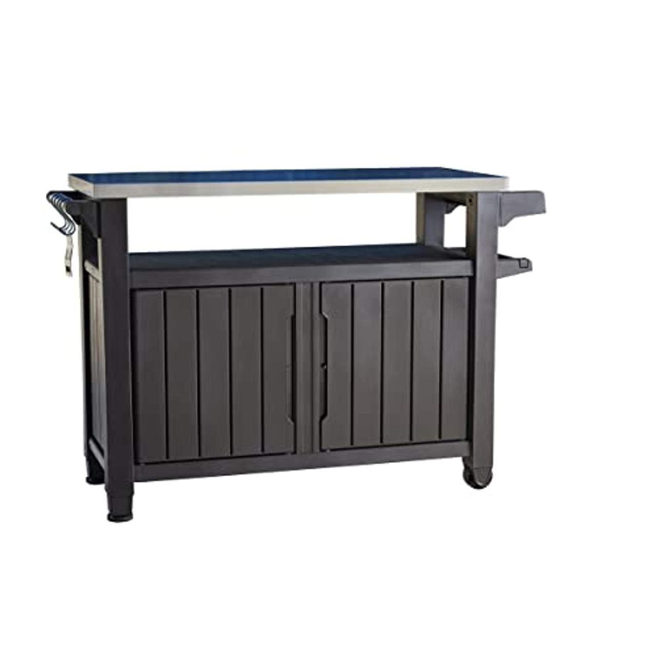 - Tragbar: Der Keter BBQ Side Table Unity XL ist mit zwei stabilen Rädern ausgestattet, sodass du ihn leicht an jeden Ort transportieren kannst.