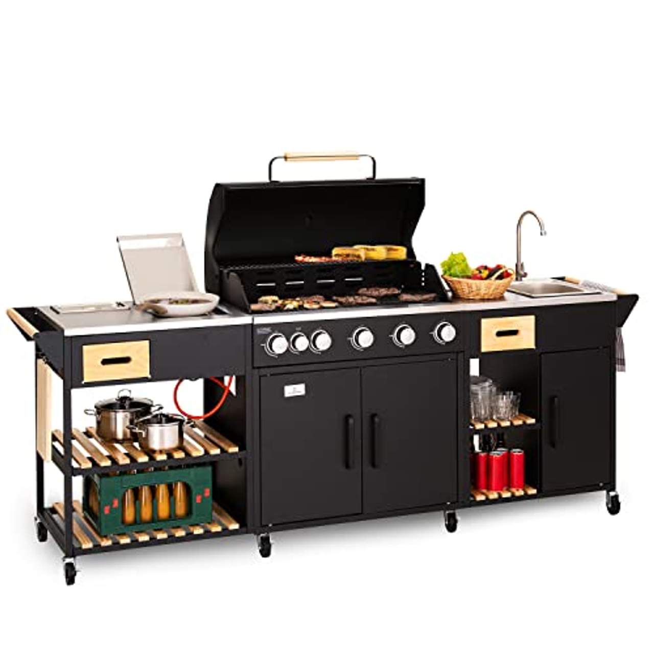 Klarstein Gasgrill für Camping Balkon GartenZuhause im Garten! Mit der Klarstein Jersey Außenküche wird der Garten zur vollwertigen Küche.Zentrum deiner neuen Jersey Outdoor Kitchen ist ein gewaltiger Grill mit 5 Edelstahlbrennern. Hier kannst du Grillen, Braten und Kochen wonach dein Herz schlägt. Die doppelwandige, pulverbeschichtete Haube ermöglicht passives Grillen und Backen. Im großen Stauraum verschwinden die Gasflasche sowie Töpfe und Pfannen.Die Arbeitsstation auf der linken Seite bietet dir nicht nur eine große Arbeitsplatte zum Vorbereiten der Speisen, sondern auch einen zusätzlichen Seitenbrenner für Soßen oder Gemüse sowie einen Frischhaltebehälter mit Deckel, z.B. für Eis oder Zutaten.Platz für Geschirr, Messer &, Co bieten eine große Schublade sowie zwei Regale unter der Arbeitsplatte.Kaum etwas ist wichtiger als Wasser zum Kochen. Entsprechend ist rechts neben dem Gasgrill eine Spülensektion zu finden. Die verfügt nicht nur über einen Wasserschlauchanschluss, sondern zusätzlich über einen weiteren Eisbehälter, eine Schublade und zwei Regalebenen.Für anfallende Reste und Schalen versteckt sich hinter einer Tür auch noch ein Abfalleimer.Damit du deine neue Jersey Außenküche auch überall dort aufstellen kannst, wo du sie benötigst, verfügt sie über acht Räder, vier mit Feststellbremsen, sowie jeweils links und rechts einen hölzernen Griff zum leichten Schieben oder Ziehen - oder zum Aufhängen von Handtüchern. Komplettiert wird das gesamte Ensemble mit einem Schneidbrett und einer Regenschutzhülle, die Wind, Regen und Staub fern hält.Willkommen daheim im Garten! Beeindrucke Freunde und Familie mit der Klarstein Jersey Außenküche!Lieferumfang:1 x Gasgrill1 x Gasschlauch1 x Druckminderer1 x Schneidbrett1 x Regenhaubemehrsprachige BedienungsanleitungAbmessungen:Maße gesamt (Haube geschlossen): ca. 236 x 114,5 x 58 cm (BxHxT)Maße gesamt (Haube geöffnet): ca. 236 x 147 x 58 cm (BxHxT)Maße Gasgrill-Teil: ca. 110 x 83 x 51,5 cm (BxHxT)Maße Grillfläche: ca. 83 x 45 cm (BxT)Maße Seitenteile: je ca. 76,5 x 87,5 x 51,5 cm (BxHxT)Maße Arbeitsflächen (Seiten): ca. 65,5 x 51,5 cm (BxT)Höhe rechtes Seitenteil mit Spüle: 118 cmMaße Spüle: 38 x 32 cm (LxB) Maße Schneidbrett: ca. 33 x 24 cm (LxB)Maße Frischhaltebehälter (links): 29,5 x 16,5 cm (LxB)Gasschlauch: ca. 80 cmGewicht: ca. 82 kgArtikelnummer:10039854
