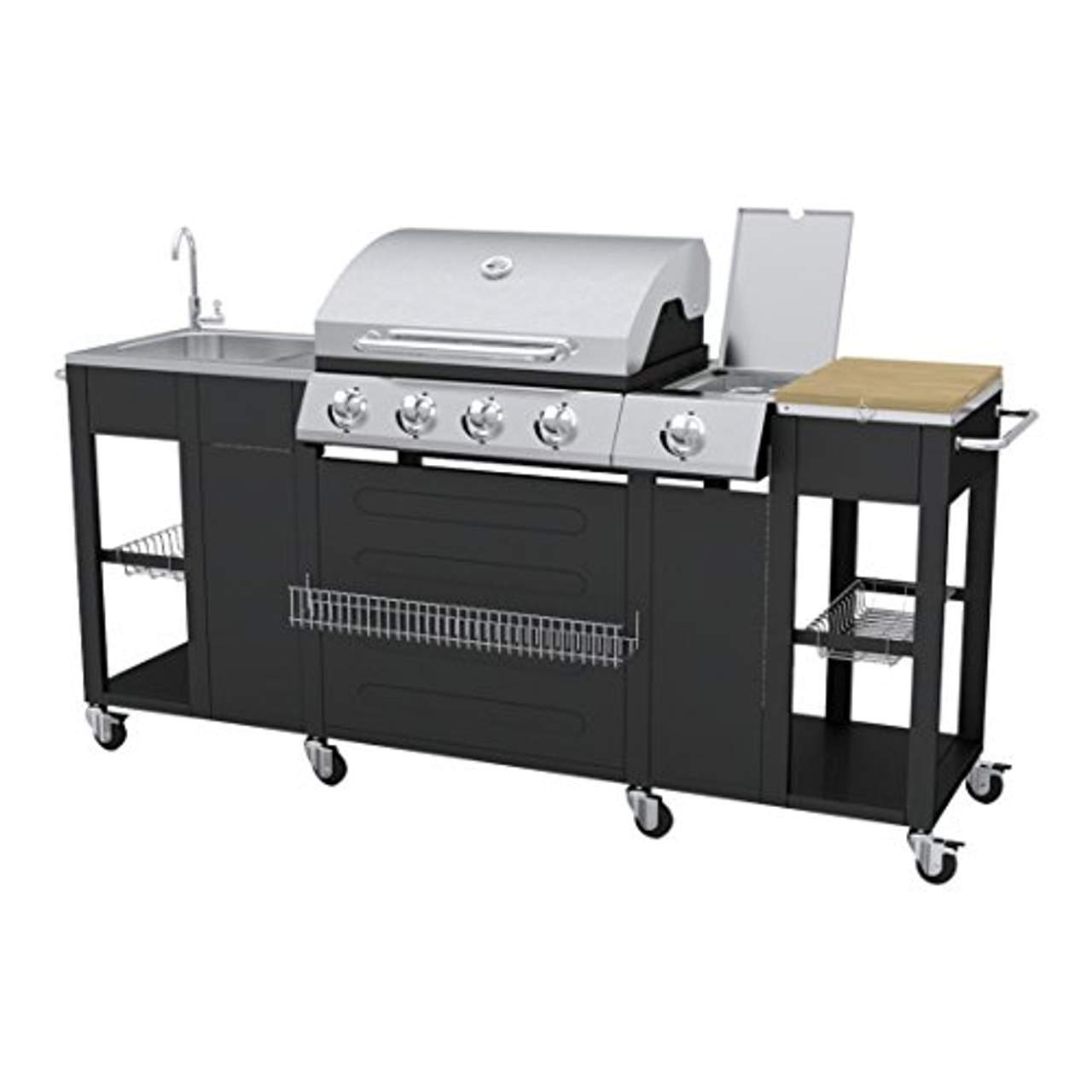 - Bequemlichkeit: Das Produkt ist dank seiner Rollen jederzeit mobil, so dass Sie es je nach Bedarf leicht in Ihrem Außenbereich bewegen können. Außerdem verfügt es über ein integriertes Holzschneidebrett, ein Edelstahlwaschbecken und -becken sowie Unterschränke aus Stahl für zusätzlichen Komfort.