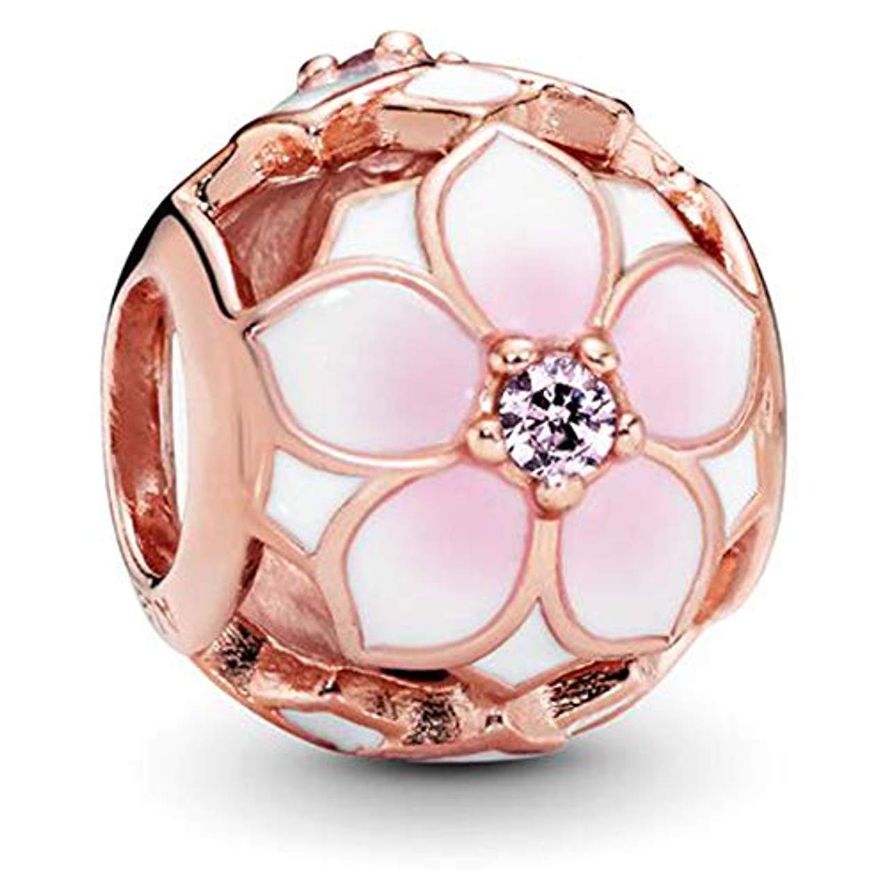 - Hochwertige Handwerkskunst: Dieser Charme ist mit Qualität Handwerkskunst gefertigt, mit rosa und weiß emailliert Magnolienblume Details, rosa Zirkonia Steine und eine Metall-Legierung von 14 Karat Roségold plating für eine fast schwerelos fühlen.