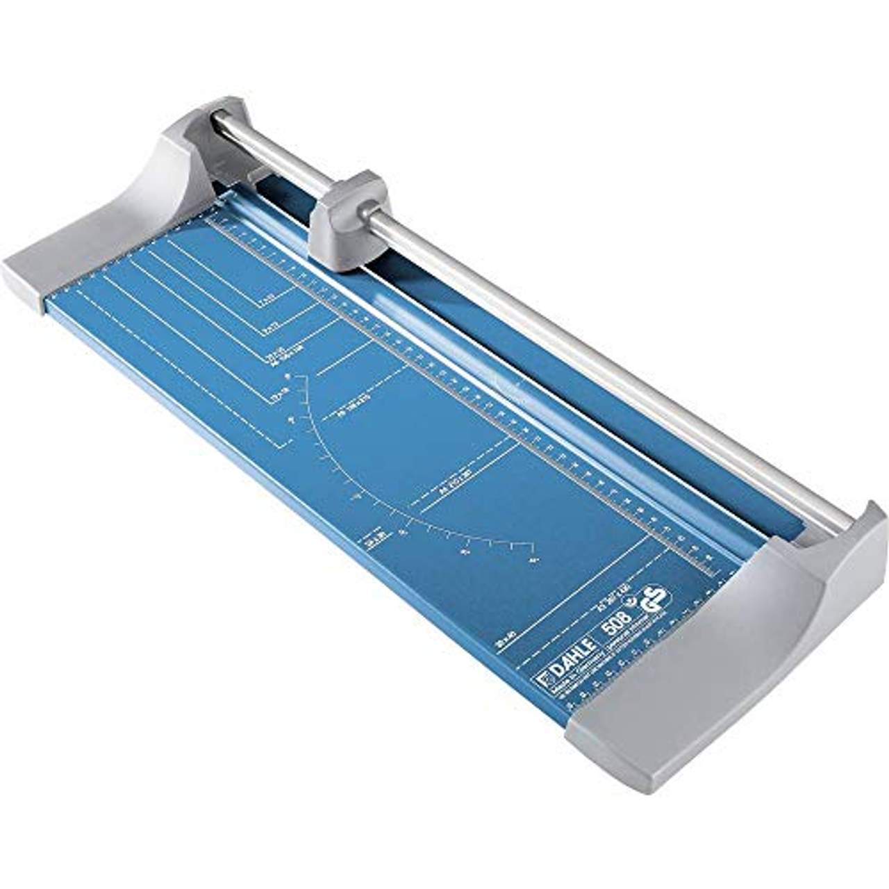 Dahle 508 Papierschneider blauFür schnelles und präzises Schneiden von Papier, Fotos und Folien bis zum Format DIN A3. Das Modell 508 schneidet mühelos bis zu 6 Blatt 70 g/m²-Papier übereinander. Die Schnittlänge liegt bei 46 cm, Schnitthöhe ist 0,6 mm. Die Schneidemaschine hat ein rotierendes Rundmesser mit Untermesser. Inklusive Messerschutz durch geschlossenen Kunststoffkopf. Die Schnittstelle wird automatisch gepreßt. Außerdem hat der Schneider ein transparentes Anpreßlineal, 2 Winkelanlagen mit cm-Teilung und zahlreiche Orientierungslinien auf der Platte. Maße: 58 x 21,1 cm