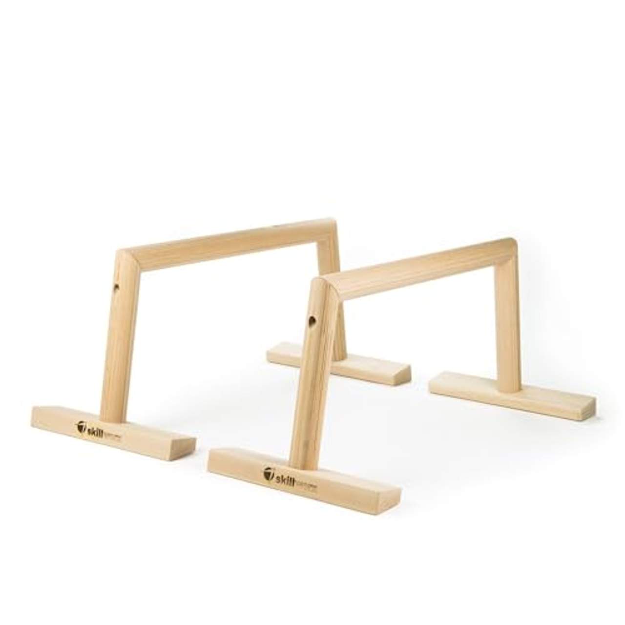 Die „skillworx Parallettes“ sind ein Produkt, das in 8 Varianten angeboten wird, so dass die Benutzer es je nach Training und Zielsetzung anpassen können. Es ist aus FSC-zertifiziertem Buchenholz gefertigt, was es leicht und mobil macht, mit Fußschrauben für den einfachen Transport. Das Produkt zeichnet sich außerdem durch absolute Stabilität mit bis zu 10° drehbaren Beinen für unebene Böden sowie durch rutschfeste Korkpolster aus. Erhältlich sind die Griffhöhen groß (30 cm) oder klein (15 cm), während die Grifflängen in Parallettes (55 cm) oder Travellettes (30 cm) erhältlich sind.