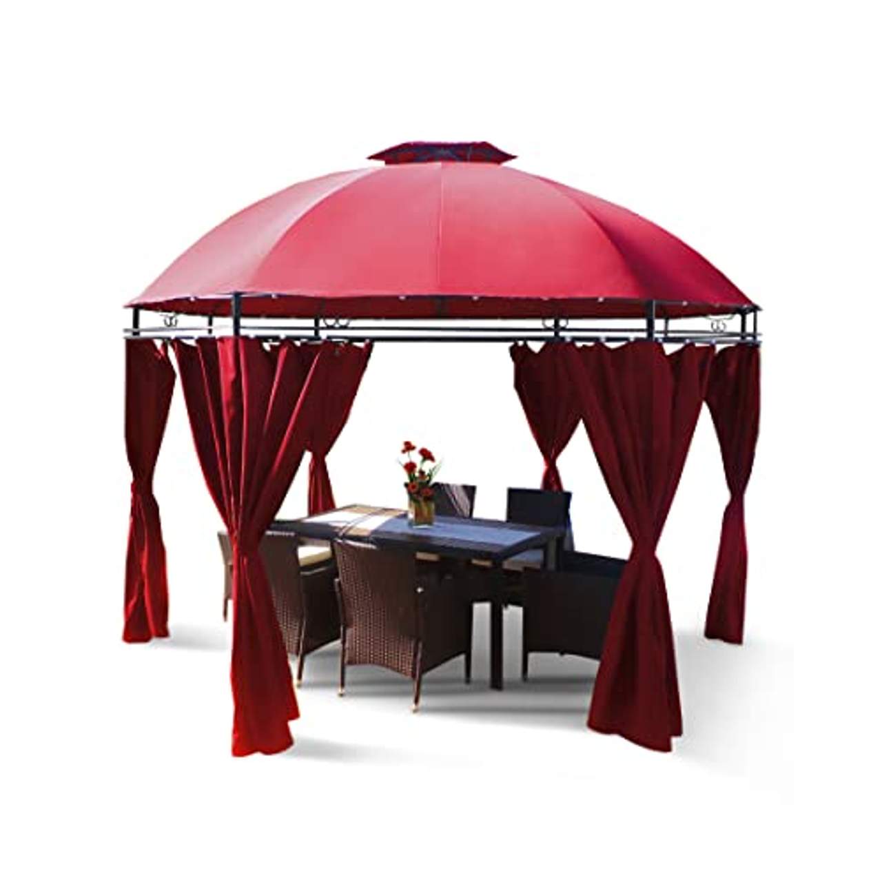 Pulverbeschichteter Rahmen: Der pulverbeschichtete Rahmen ist mit edlen Ornamenten verziert, die dem Pavillon ein exklusives Design verleihen und ihn gleichzeitig widerstandsfähiger gegen Witterungseinflüsse wie Regen oder Wind machen.