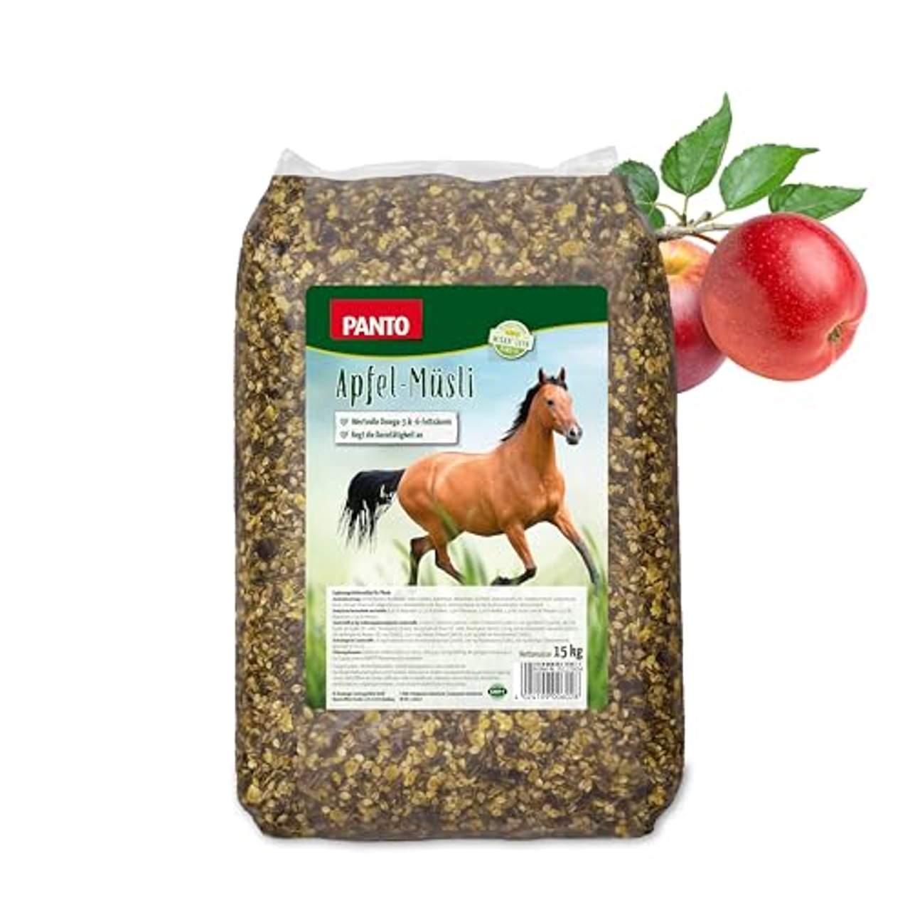 Panto Apfel-Müsli 1er PackDas Panto Apfelmüsli ist die Feinschmecker-Variante unseres Pferdemüslis. Mit leckerem Apfeltrester und dem fruchtig frischen Geruch der Äpfel ist es auch für wählerische Pferde gut geeignet. Ebenso wie unser Pferdemüsli ist es haferfrei und kann problemlos mit Hafer ergänzt werden.Durch die hydrothermische Behandlung (wärmebehandelt) der Komponenten wird die enthaltene Stärke für das Pferd besser verfügbar gemacht. Sie kann bereits im Dünndarm zu einem höheren Grad verdaut werden, als bei unbehandeltem Getreide. Die enthaltenen Pektine im Apfeltrester binden Wasser und Schadstoffe im Magen-Darm-Trakt und wirken positiv auf die Darmflora.Die eingesetzten Pellets enthalten alle Vitamine, Mineralstoffe und Spurenelemente, die das Pferd benötigt. Auch eignet es sich sehr gut als Belohnungsfutter für die Handvoll danach für Pferde und Ponys, die wenig gearbeitet werden. Sollten Sie weniger als die empfohlene Menge füttern, empfehlen wir die zusätzliche Fütterung von Panto Pferdemineral oder die Panto Mineralleckschale für Pferde, um den fehlenden Bedarf zu decken.Ergänzungsfuttermittel