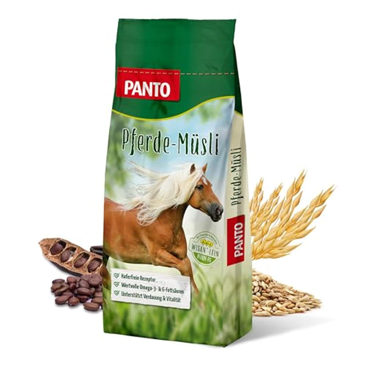 Panto Pferdemüsli 1er PackDas Panto Pferdemüsli mit Wisan-Lein ist das haferfreie Basis Müsli unseres Sortiments. Die ausgewogene Mischung aus thermisch aufgeschlossenem Getreide macht es zu einer gut verdaulichen Mischung für normal gearbeitete Pferde/Ponys. Die thermische Behandlung einzelner Komponenten erhöht den Stärkeaufschlussgrad und macht sie fürs Pferd besser verdaulich. Der im Pellet eingesetzte Wisan-Lein fördert den Fellglanz und wirkt positiv auf die Verdauung und somit die Leistungsfähigkeit. Auch eignet es sich sehr gut als Belohnungsfutter für die Handvoll danach für Pferde und Ponys, die wenig gearbeitet werden.Die Pellets enthalten alle benötigten Vitamine, Mineralstoffe und Spurenelemente. Sollten Sie weniger als die empfohlene Menge füttern, empfehlen wir die zusätzliche Fütterung von Panto Pferdemineral oder der Panto Mineralleckschale für Pferde, um den fehlenden Bedarf zu decken.Ergänzungsfuttermittel