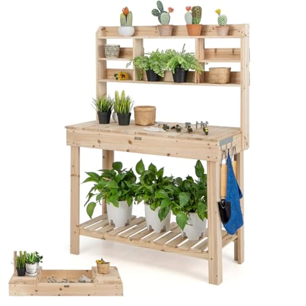 Der „COSTWAY Pflanztisch mit aufklappbarer Tischplatte“ besticht durch seine hochwertige Tannenholzkonstruktion, seine außergewöhnliche Haltbarkeit und seine cleveren Designmerkmale. Die großzügigen Aufbewahrungsmöglichkeiten, darunter dreistufige Regale, ein unteres Regal und seitliche Haken, sorgen für eine effiziente Organisation bei der Gartenarbeit. Besonders erwähnenswert ist die klappbare Tischplatte, die einen einfachen Zugriff ermöglicht und Unordnung verdeckt. Die ergonomische Arbeitshöhe minimiert die Belastung und erhöht den Benutzerkomfort. In unserem Produktkaufführer hat er sehr gut abgeschnitten und ist damit eine Top-Empfehlung in deinem persönlichen Pflanztisch-Test für alle, die einen langlebigen, funktionalen und ästhetisch ansprechenden Gartenarbeitstisch suchen.