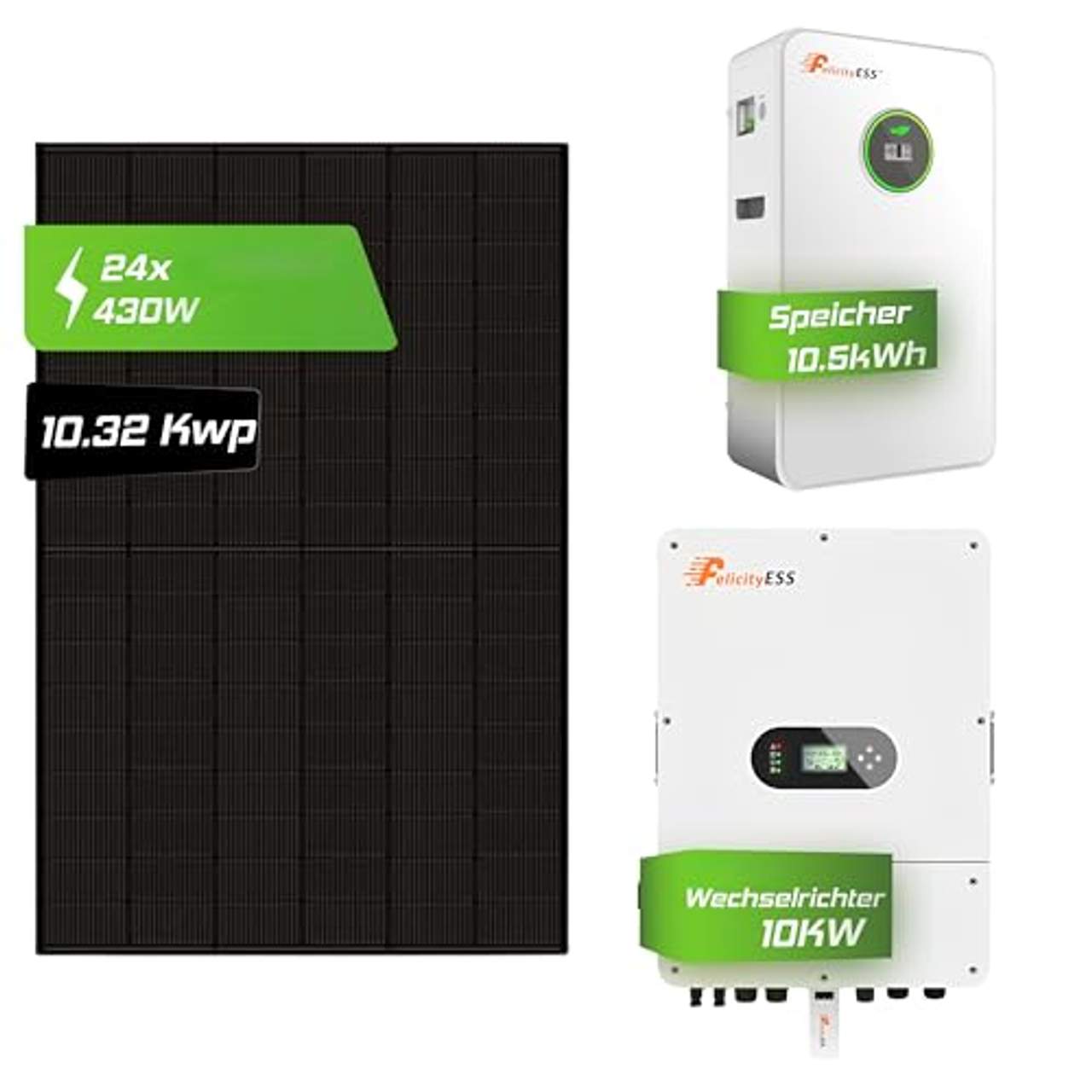 | Lieferumfang | Lieferumfang Jolywood 430W JW-HD108N, Felicity 10,5kWh Speicher LUX-E48200LG03, T-REX-10KLP3G01 Hybridwechselrichter |