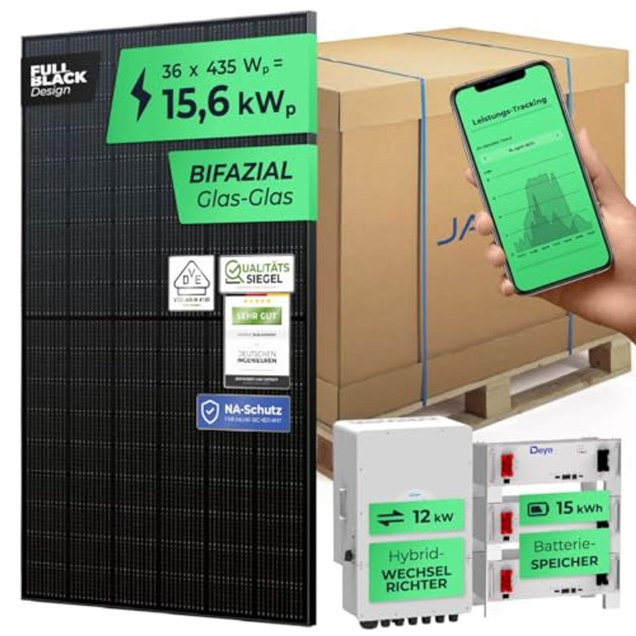 | Lieferumfang | 36 x 435 Watt Solarpanels der Marke JaSolar Modell JAM54D41 (insg. 15,6 kWp) ‒ 25 Jahre Herstellergarantie, 30 Jahre lineare Leistungsgarantie 1x Hybrid-Wechselrichter der Marke Deye mit 12 kW Ausgangsleistung Deye SUN-12K-SG04L P3-EU ‒ 10 Jahre Herstellergarantie 3x Batteriespeicher der Marke Deye mit je 5,1 kWh Speicherkapazität (insg. 15,3 kWh) Deye SE-G5.1 Pro ‒ 10 Jahre Herstellergarantie 1x 100m Solarkabel (⌀ 6 mm²) + 6x MC4 Steckerpaare |