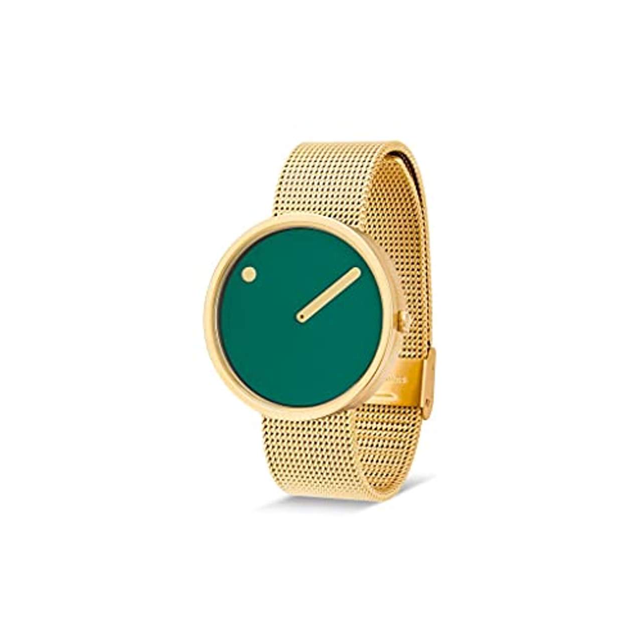 Picto Armbanduhr Ø40 TannengrünDie PICTO Armbanduhren sind genau das Richtige für Damen und Herren, die eine Uhr mit außergewöhnlichem Design suchen! Die PICTO Uhren wurden im Jahr 1984 von den beiden dänischen Hippies Steen Georg Christensen und Erling Andersen entworfen.Ziel war es, die Uhren so minimalistisch wie möglich zu designen. Das feingliedrige gelbvergoldete Edelstahlarmband ist besonders robust und strapazierfähig. Auf dem grünen Ziffernblatt wird die Zeit als Piktogramm in gelbvergoldet mit einem Stundenpunkt und einem Minutenzeiger abgelesen.