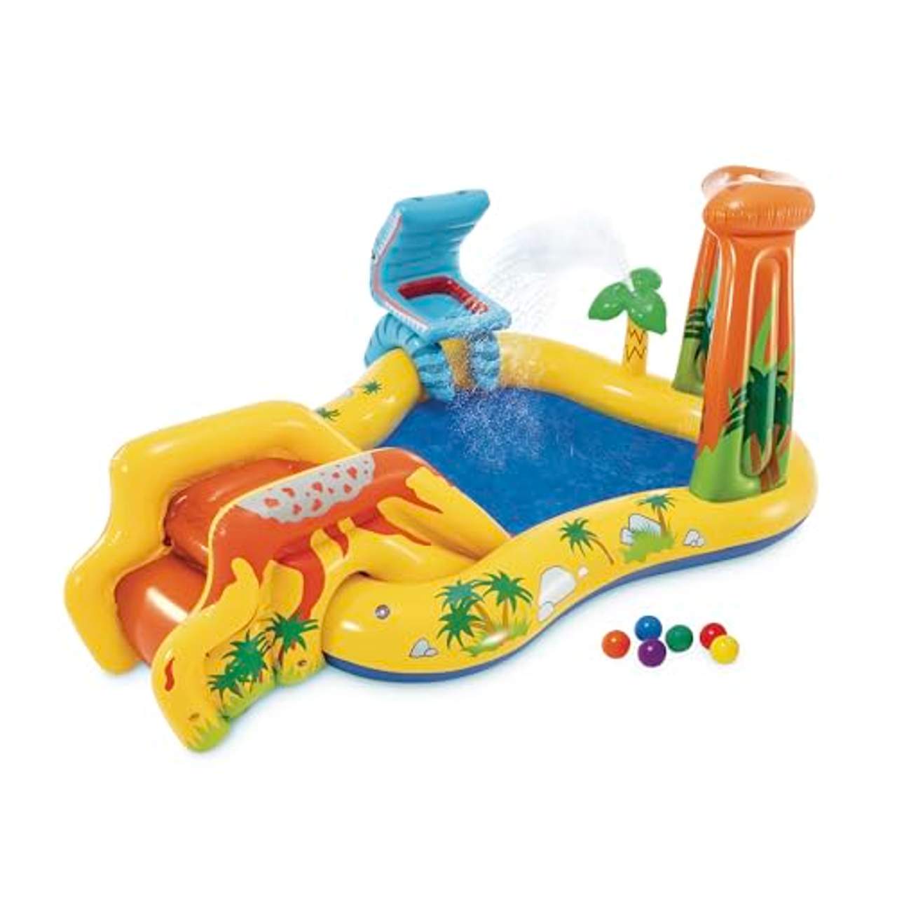 Intex 57444NP Aufblasbares Wasserspielcenter DinosaurierPlay Center „Dinosaur“Dieses Play Center ist für alle Dinofans und Kids, die im Sommer eine erfrischende Abkühlung brauchen! Die Kleinen können über den Vulkan rutschen und den hungrigen Dino mit bunten Bällen füttern! (6 bunte Bälle enthalten). Wenn man einen Gartenschlauch mit anschließt kann man die Palme in eine Fontäne und den Felsvorsprung in einen Wasserfall verwandeln. Ein erfrischender Spaß für Klein und Groß!Maße: 249 x 191 x 109 cmMaximale Belastung: 81 Kg