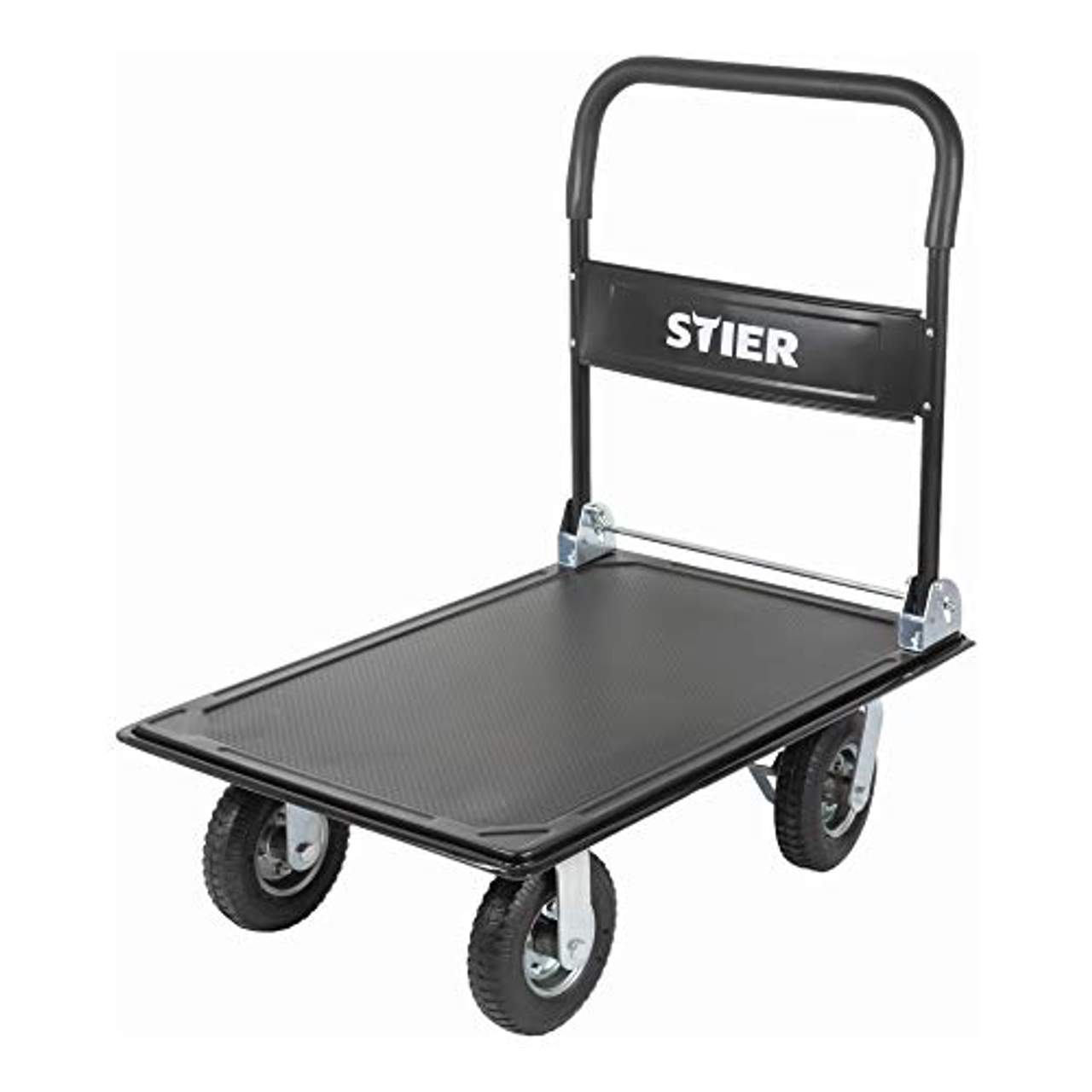 STIER Plattformwagen Tragkraft 300kgDer praktische Plattformwagen für den Transport von schweren Lasten in Büro, Lager und Werkstatt.Eigenschaften:Klappbarer Schiebebügel für einfache und platzsparende LagerungRobuste Ganzstahlkonstruktion mit 300 kg Tragkraft200 mm Luftbereifung für problemlosen und einfachen Transport auf jedem UntergrundHochwertige PulverbeschichtungAntirutschbelag für sicheren Transport der TeileUmlaufender StoßschutzAnwendungsgebiete:Optimal geeignet für den sicheren und einfachen Transport schwerer Lasten, wie Material, Pakete oder GetränkekästenLieferumfang:1x STIER Plattformwagen, klappbar, Tragkraft 300kg, mit LuftbereifungBedienungsanleitungSTIER-Produkte werden von Profis aus Handwerk und Industrie entwickelt und verbinden in höchstem Maße Leistungsstärke und Ergonomie.Kraftvoll. Widerstandsfähig. Langlebig.Tausende Kunden vertrauen dem besten Preis-Leistungs-Verhältnis. Erlebe auch du die STIER Produktpalette auf unserer Markenseite.