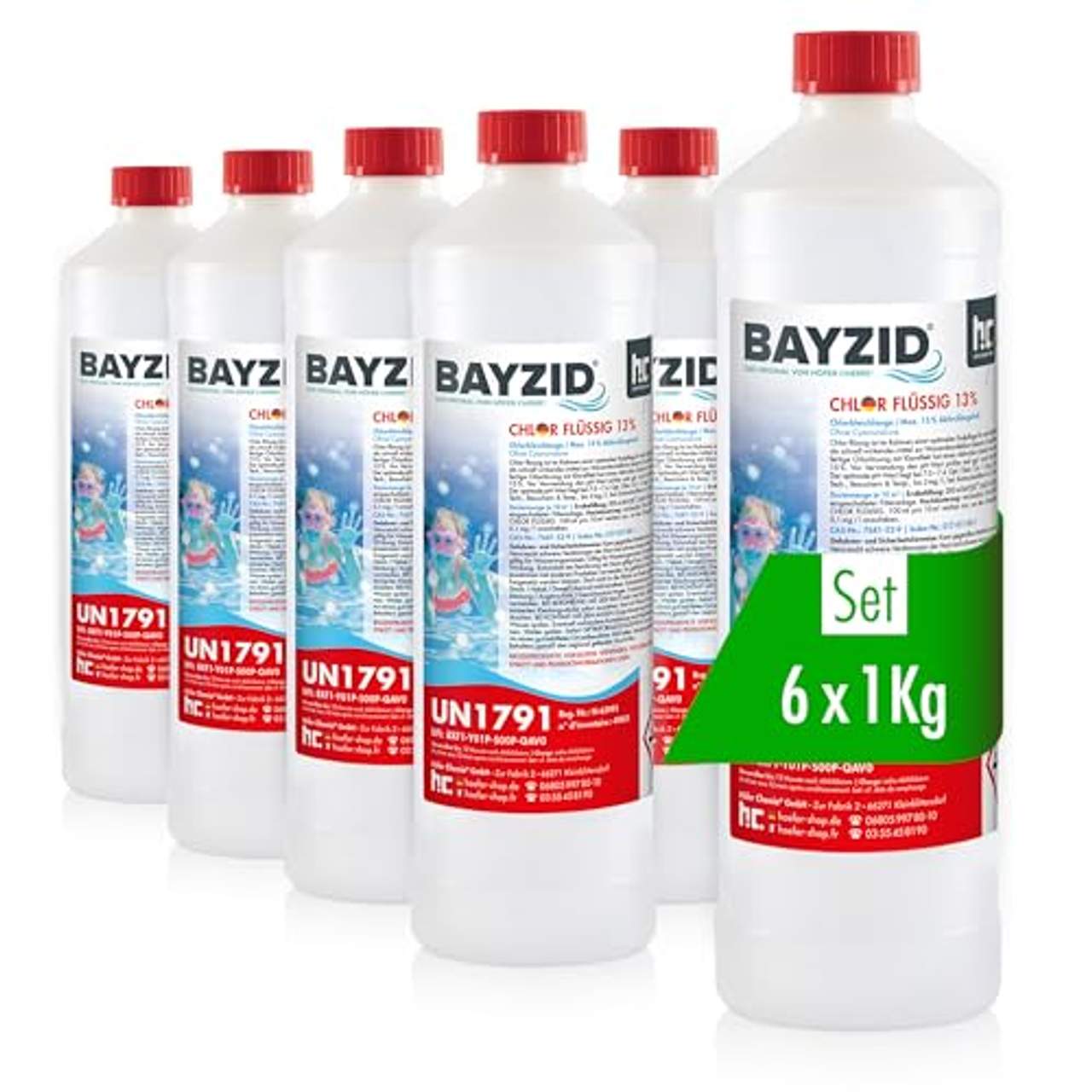 Höfer Chemie 6 x 1 kg Chlor flüssig in handlicher FlascheFlüssigchlor in 1 kg-Flaschen zur schnellen Anhebung des Chlorgehalts in Schwimmbecken Die gebrauchsfertige BAYZID Flüssigchlor-Lösung von Höfer Chemie ist ein schnell wirkendes Desinfektionsmittel mit Klareffekt und einem 13 - 15 % Aktivchlorgehalt. So können Sie Ihr Schwimmbad zuverlässig von Bakterien befreien und den Chlorgehalt im Pool schnell oder auch langfristig anheben. Wichtiger Hinweis zur Lagerung: Bitte IMMER den original Entgasungsverschluß auf den Flaschen belassen, damit Gase entweichen können, ansonsten können die Flaschen platzen!Anwendung & Lagerung von Flüssigchlor Die handlichen 1kg Flaschen eignen sich besonders für Quick-Up-Pools und Whirlpools oder Planschbecken, weil sie sich gut dosieren lassen. Sie sollten die Flaschen gut verschlossen an einem belüfteten und dunklen Ort aufbewahren.Die Flaschen besitzen einen sogenannten Entgasungsverschluss, der dafür sorgt dass die Gase innerhalb der Flasche jederzeit entweichen können und die Flasche nicht platzt. Aus dem Grund muss die Flasche auch immer aufrecht stehen. Liegt sie, kann das Chlor auslaufen und Bleichflecken verursachen.Zudem wird das Chlor schneller verbraucht, wenn es mit Sonnenlicht in Kontakt kommt. Aus dem Grund sollten die weißen Flaschen Flüssigchlor immer im Dunkeln aufbewahrt werden. Dosierung Achten Sie unbedingt darauf, zunächst den optimalen pH-Wert von 7.0-7.4 einzustellen.Ist der pH-Wert nicht richtig eingestellt, kann das Chlor nicht seine volle Wirkung entfalten und ggf. muss mehr Chemie als notwendig verwendet werden. Erstdosierung: Pro 10m³ Wasser 200 ml Chlor flüssig. Nachdosierung: Pro 10 m³ und je nach Wetterlage geben Sie 100 ml wöchentlich hinzu. 100 ml pro 10m³ Wasser reichen aus, um den Chlorgehalt um 0,1 mg/l anzuheben. Optimaler Chlorwert: 0,6 - 1,5 mg/l (Je nach Technik, Besucherzahl und Temperatur, bis zu 2 mg/l. Bei Verwendung von Kartuschenfiltern bis zu 3,0 mg/l). Bitte Schutzhandschuhe/Schutzkleidung tragen. Wie messe ich den Chlorgehalt im Schwimmbad? Um den Chlorwert zu messen, benötigen Sie einen Wassertester. In unserem Poolzubehör-Sortiment haben wir einige Chlortester zusammengestellt: Manueller Pool-Test-Kit mit DPD & Phenolred Tabletten Teststreifen 5-in-1 GoTest Photometer PolLab Photometer .